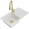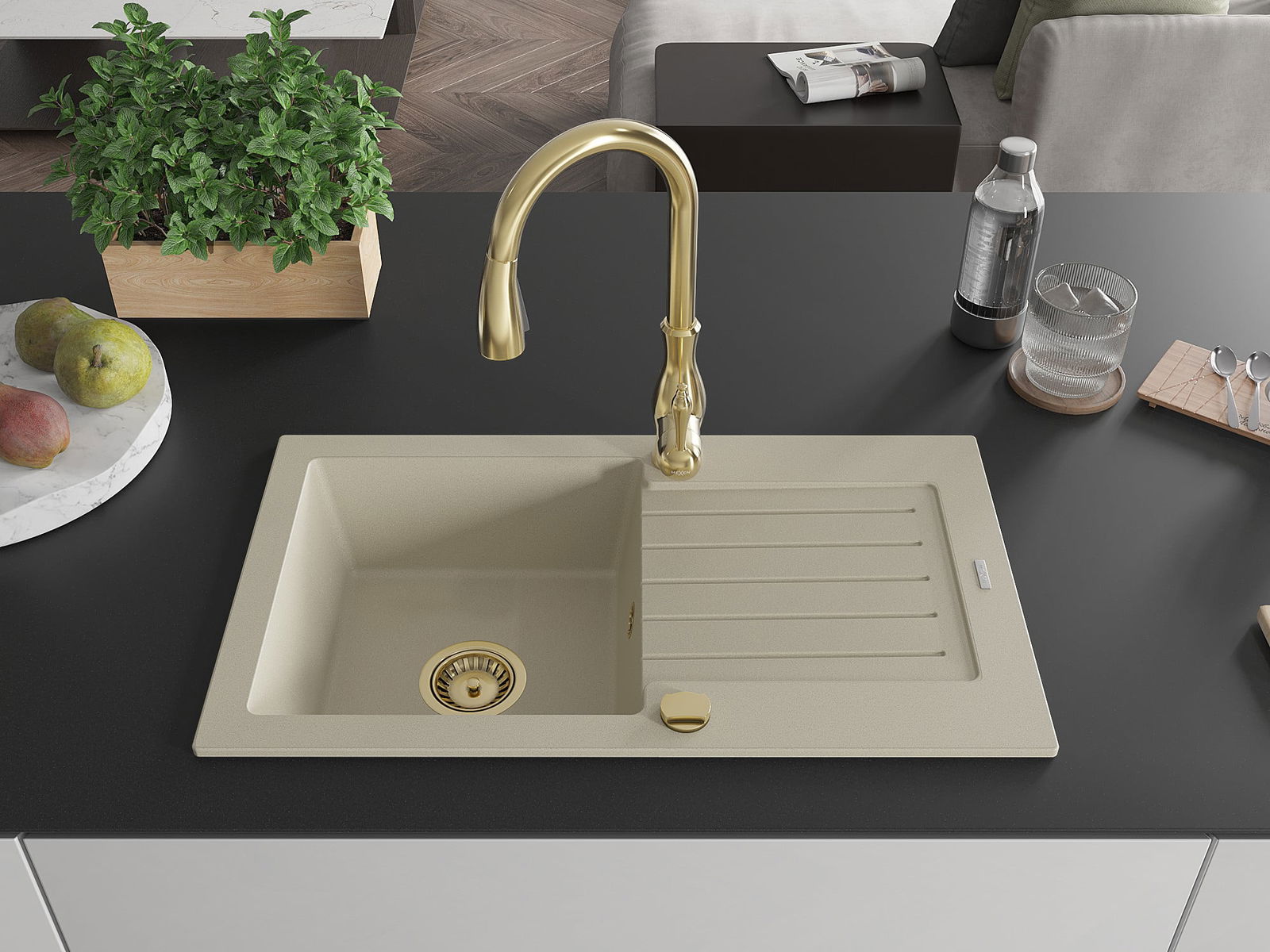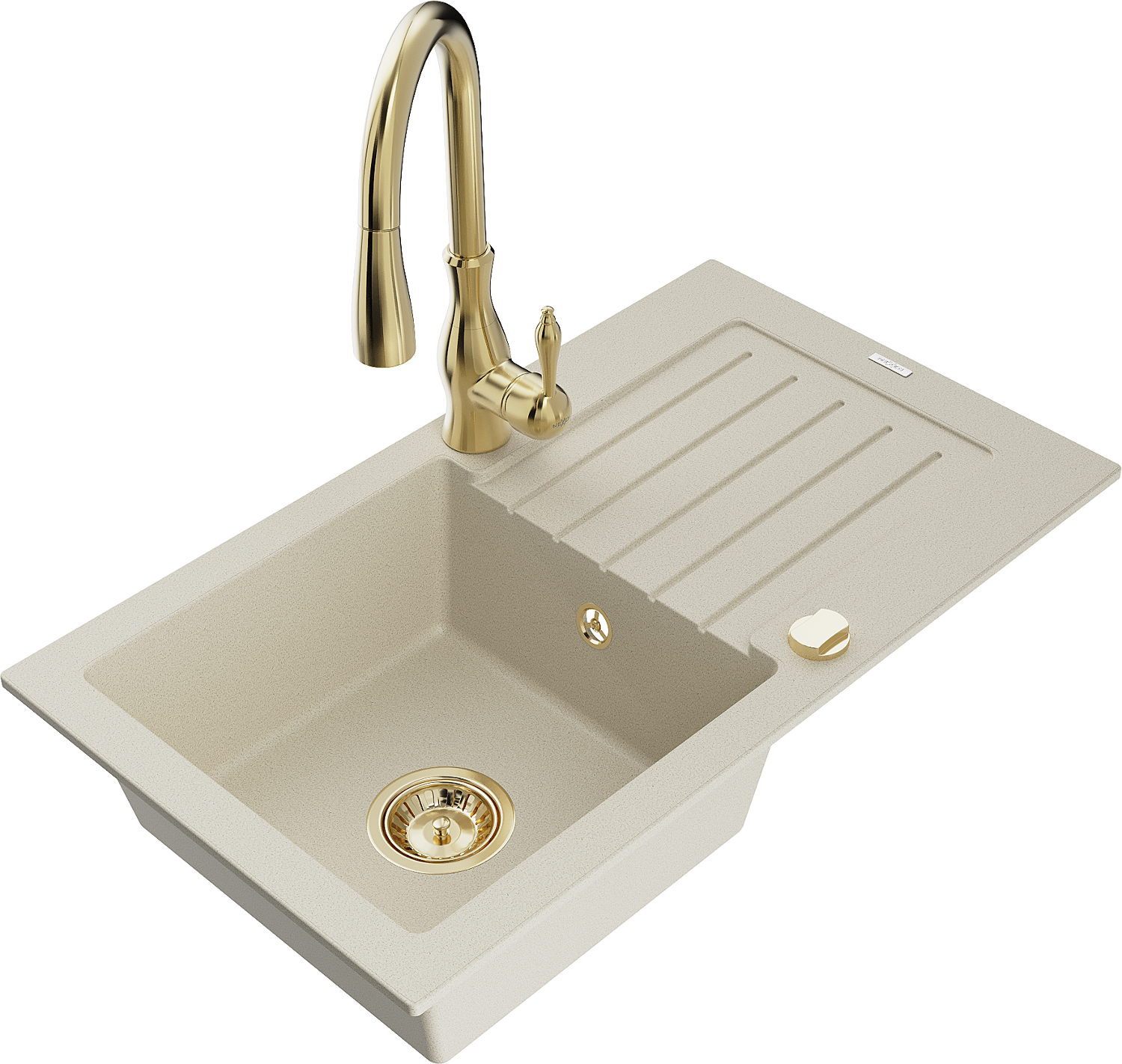 Mexen Pablo granitový dřez, 1-komorový s odkapávačem a kuchyňskou baterií Savita, béžový - 6510-69-672601-50