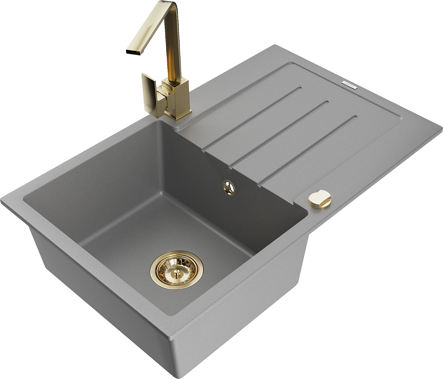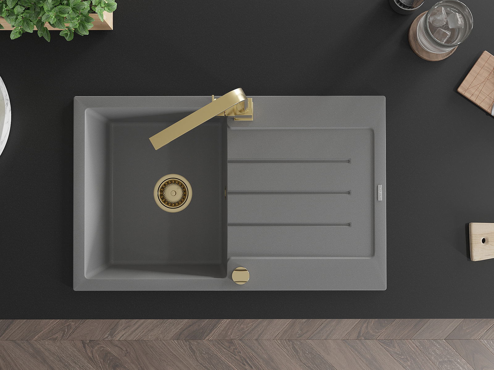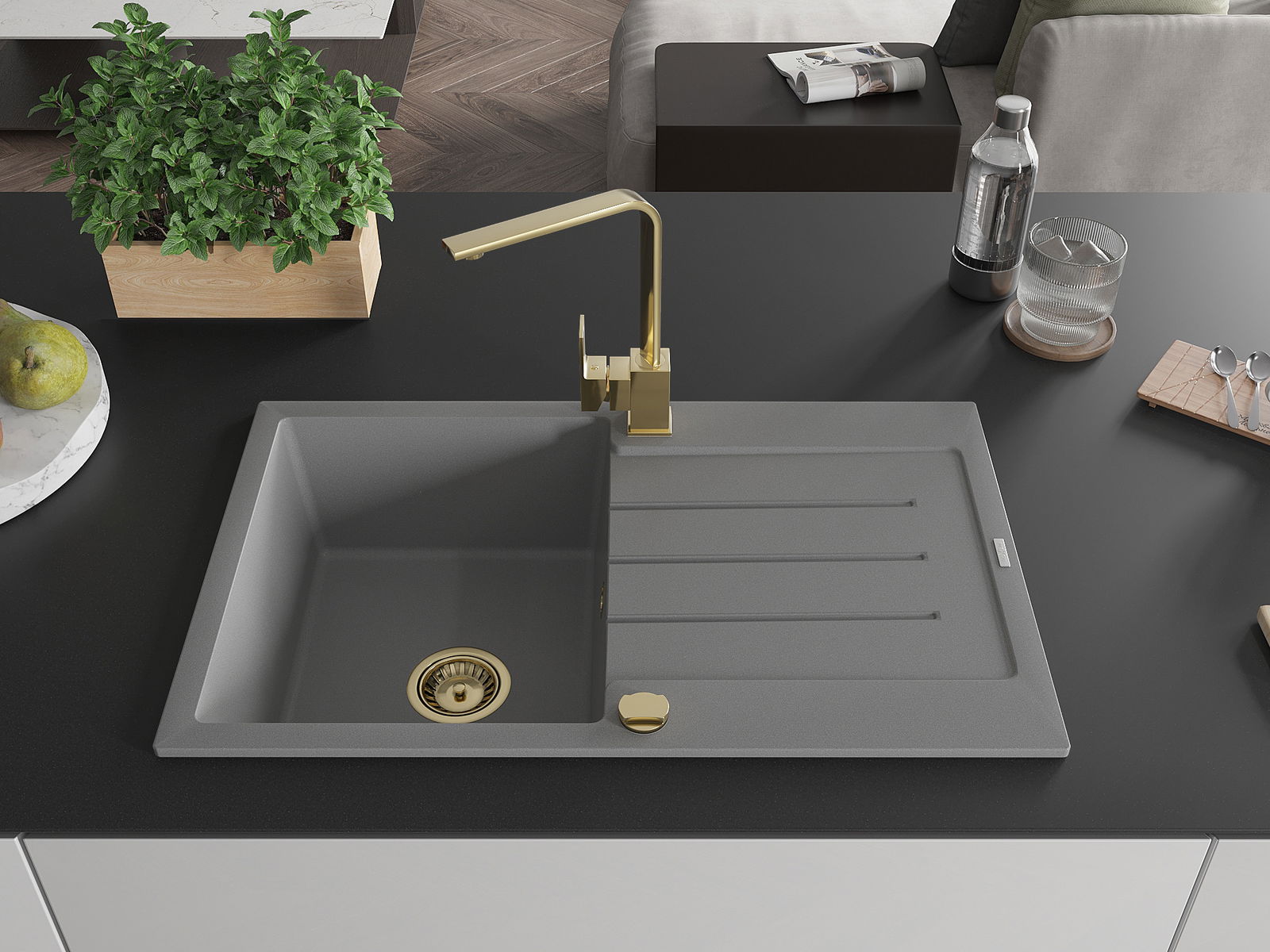 Mexen Bruno granitový dřez 1-komorový s odkapávačem a kuchyňskou baterií Rita, šedý - 6513-71-670300-50