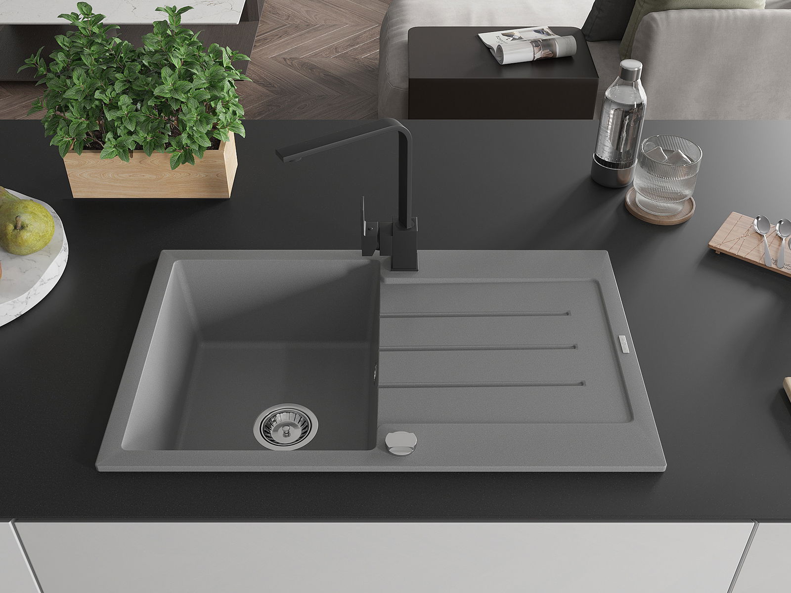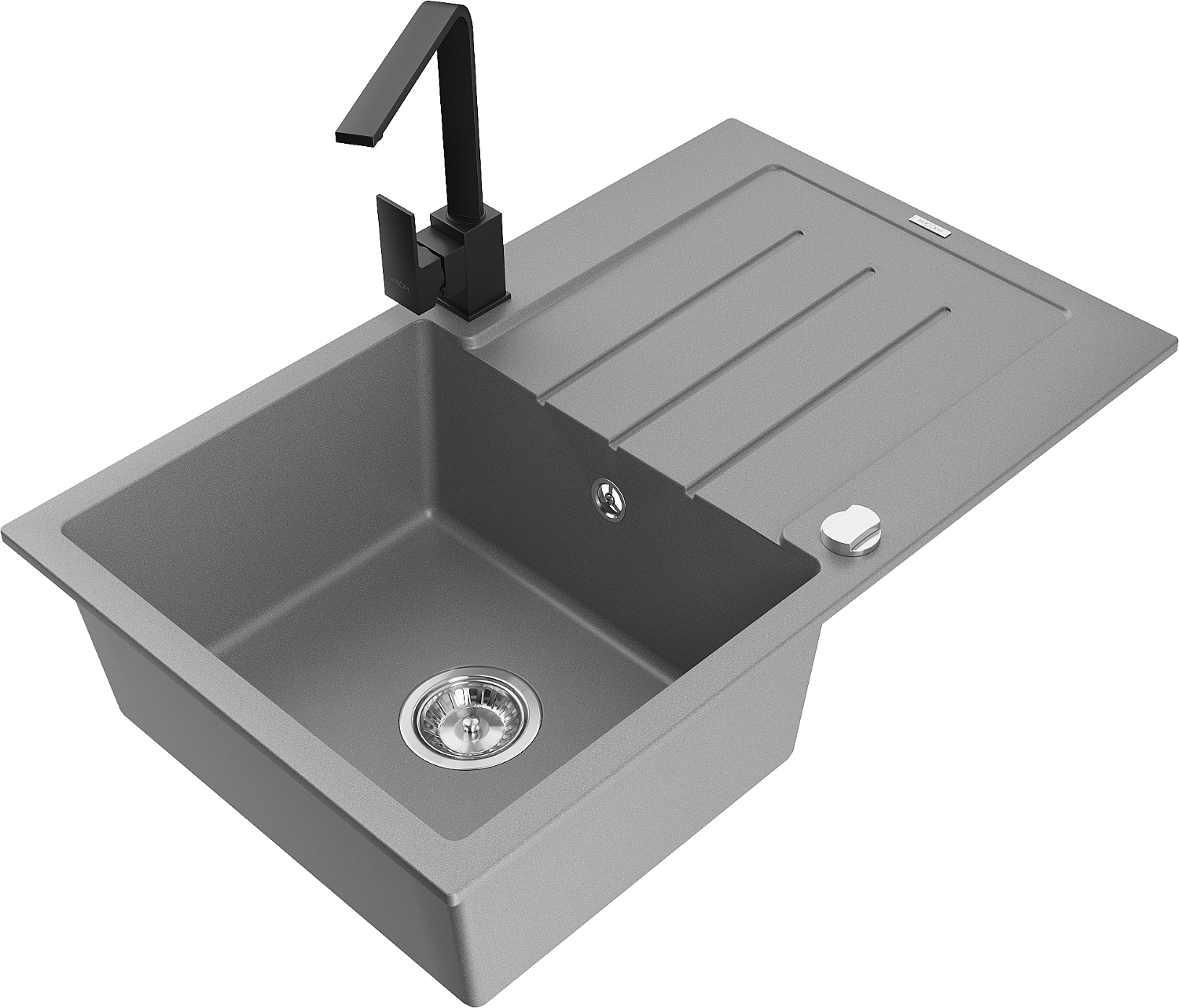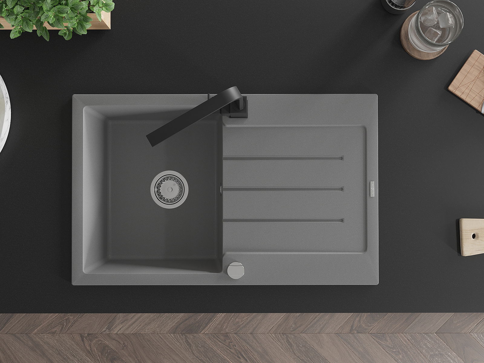 Mexen Bruno granitový dřez 1-komorový s odkapávačem a kuchyňskou baterií Rita, šedý - 6513-71-670300-70