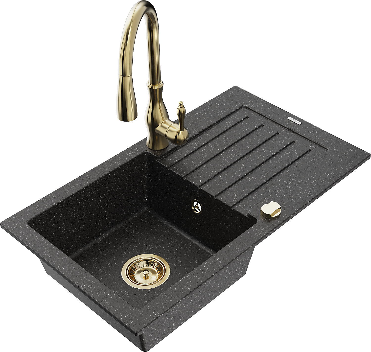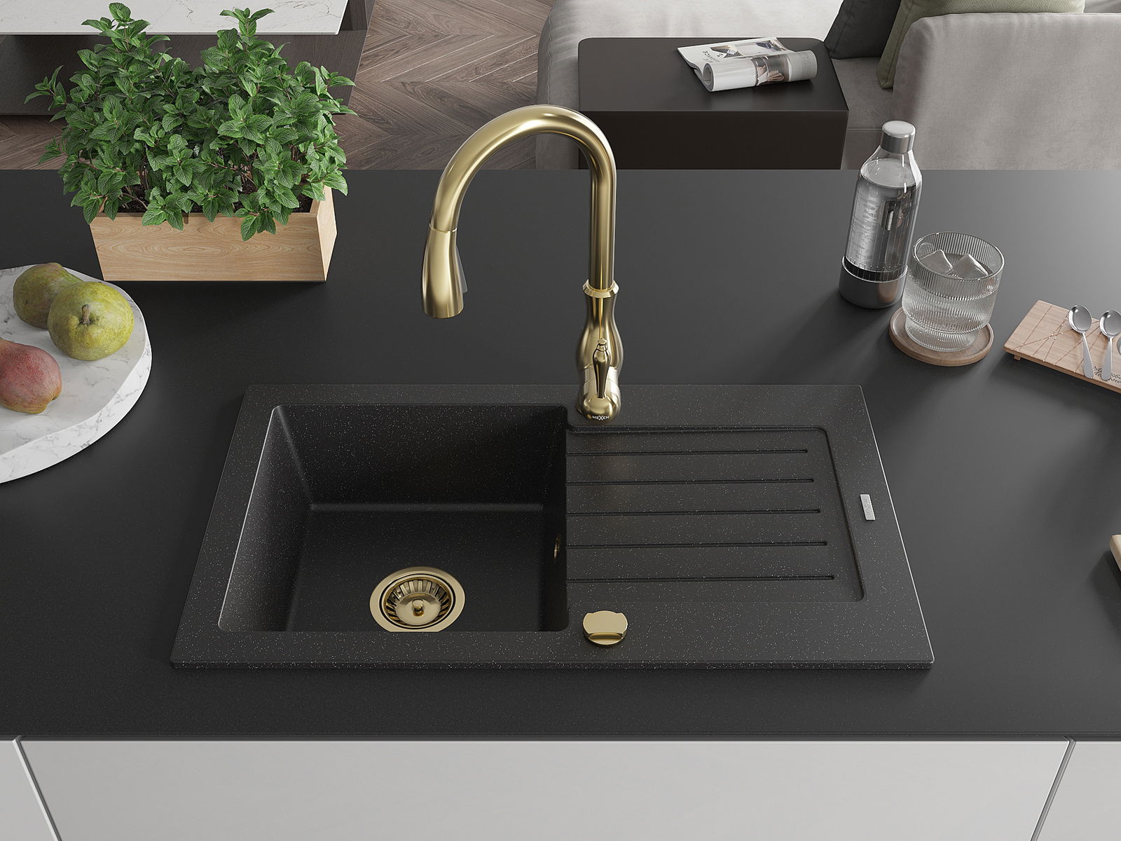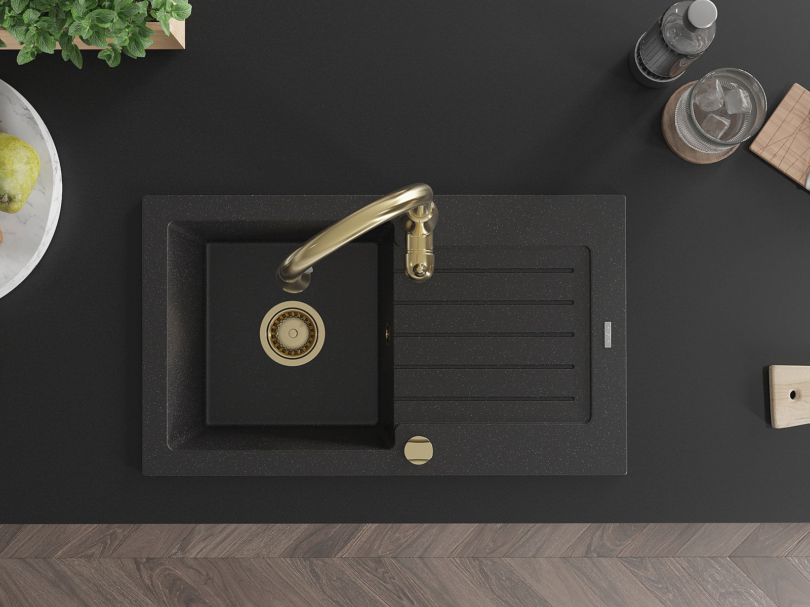Mexen Pablo granitový dřez 1-komorový s odkapávačem a kuchyňskou baterií Savita, černý/stříbrný metalik - 6510-73-672601-50