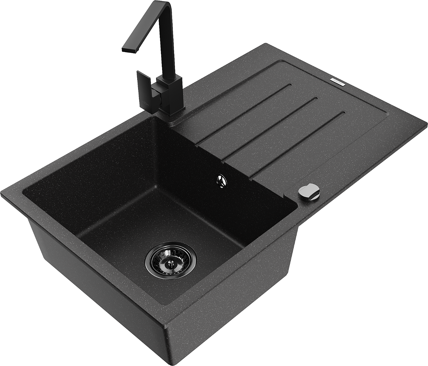 Mexen Bruno granitový dřez s 1 komorou a odkapávačem a kuchyňskou baterií Rita, černý/stříbrný metalík - 6513-73-670300-70-B