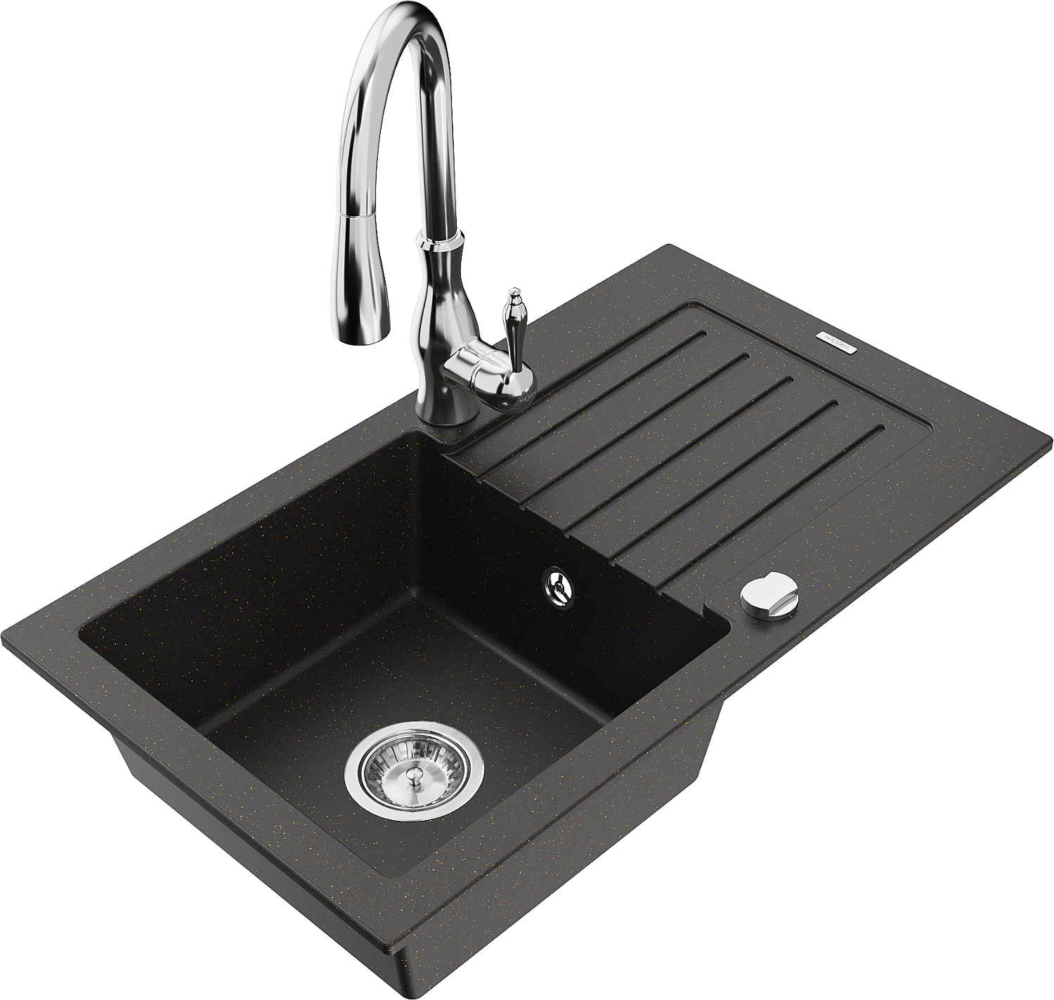 Mexen Pablo žulový dřez s 1 komorou a odkapávačem a kuchyňskou baterií Savita, černý/zlatý metalik - 6510-75-672601-00