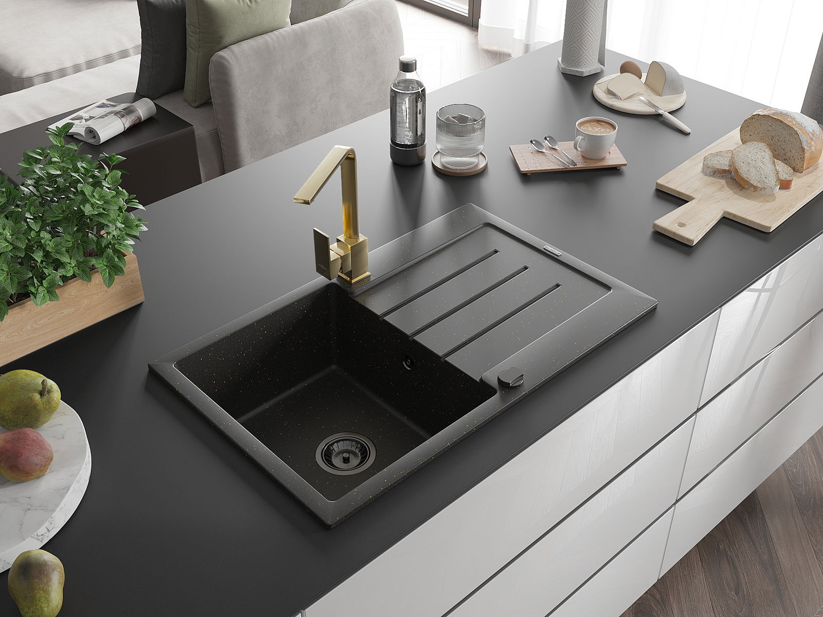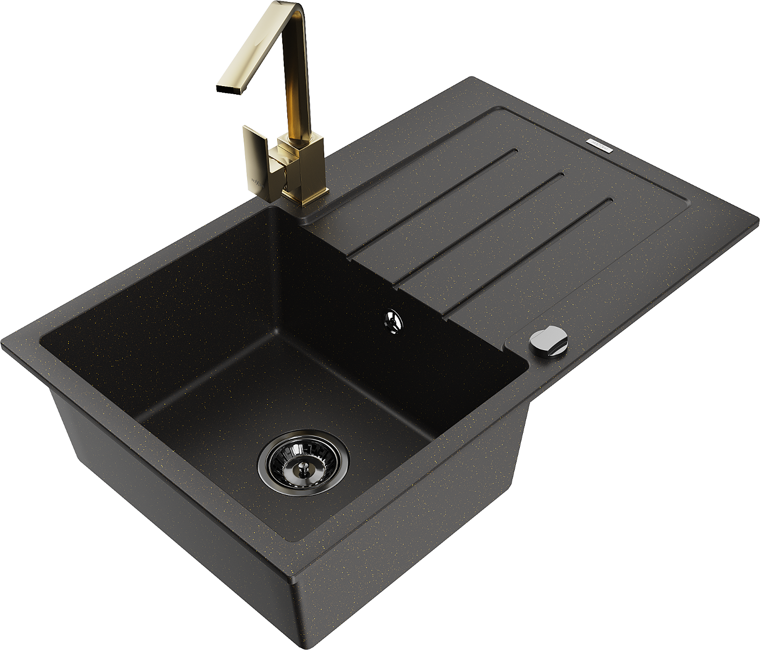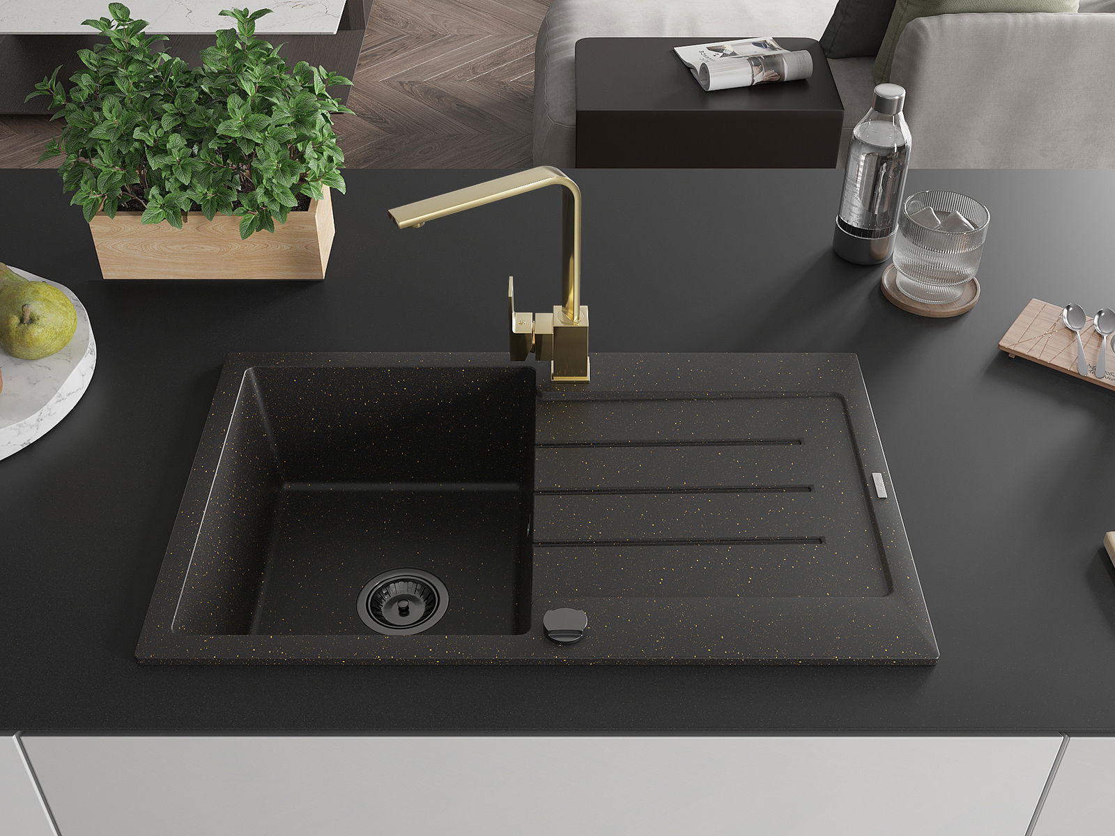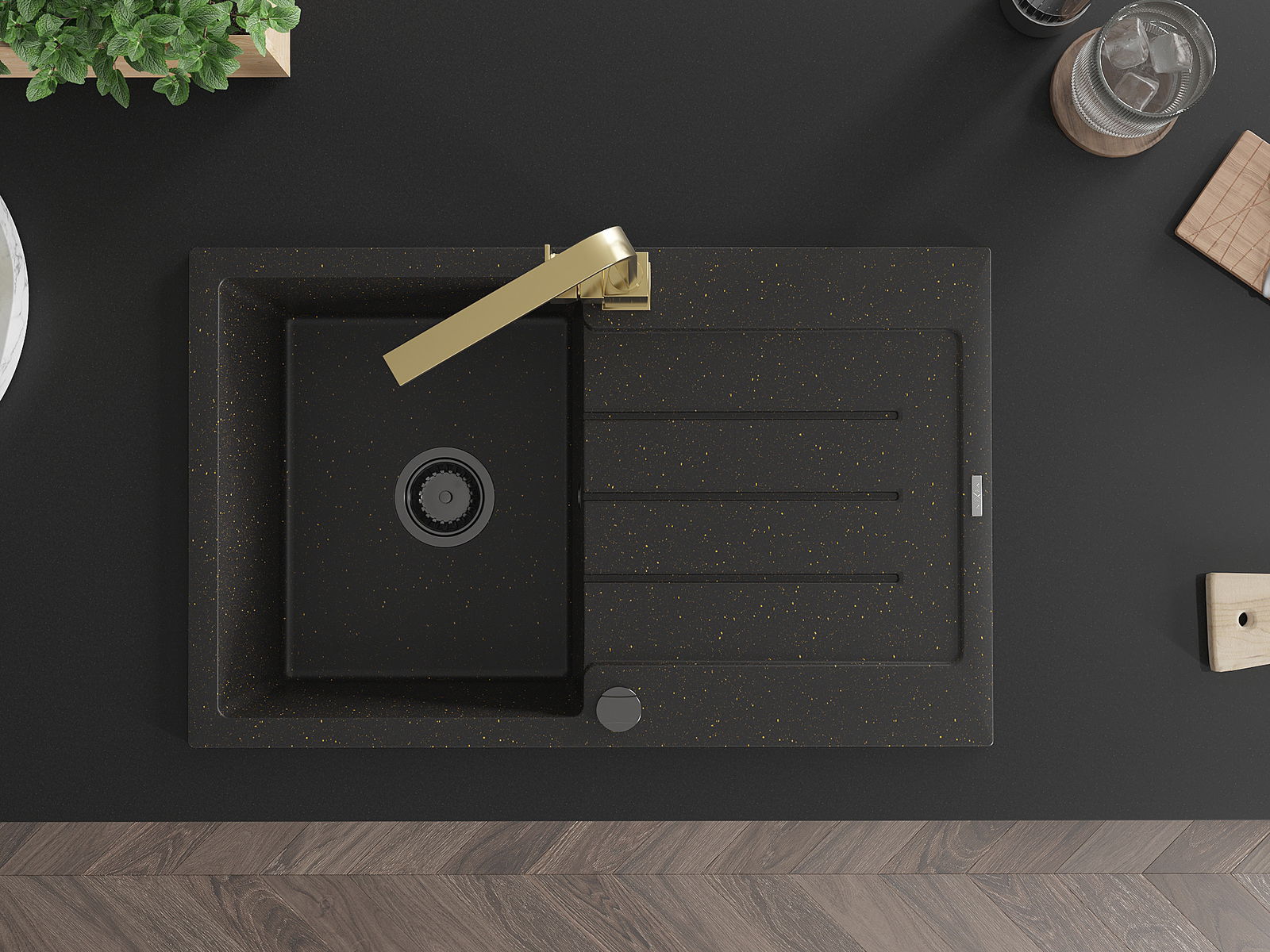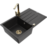 Mexen Bruno granitový dřez s jednou komorou s odkapávačem a kuchyňskou baterií Rita, černo/zlatý metalický