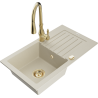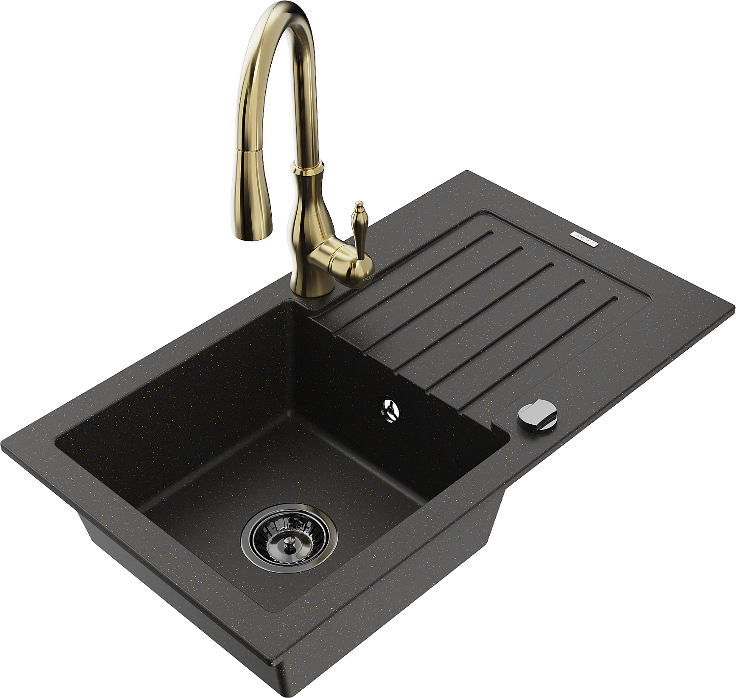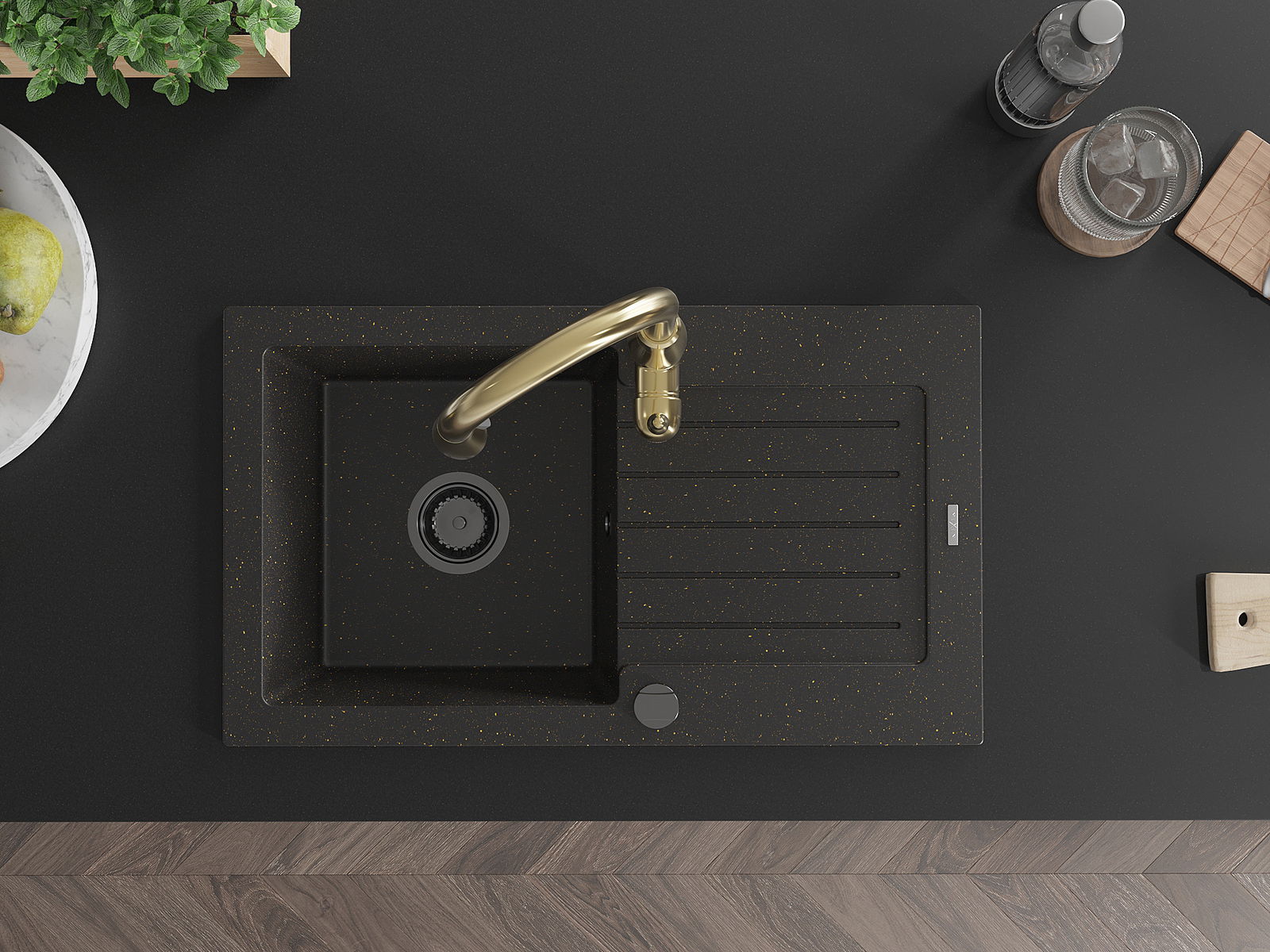 Mexen Pablo žulový dřez 1-komorový s odkapávačem a kuchyňskou baterií Savita, černá/zlatý metalik - 6510-75-672601-50-B