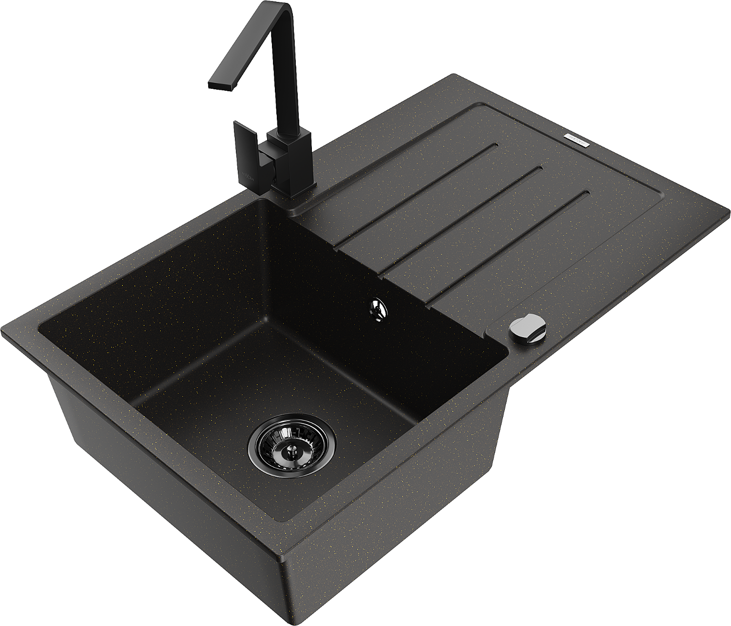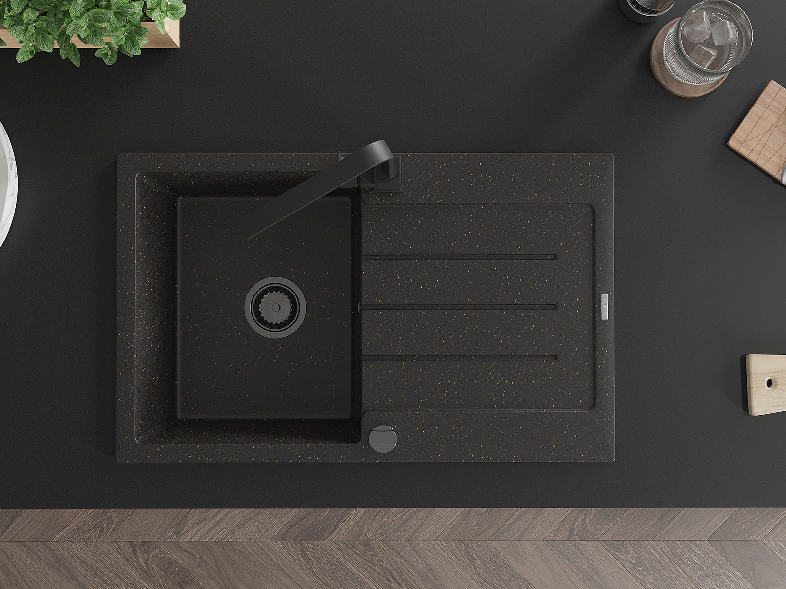 Mexen Bruno jednorohový granitový dřez s odkapávačem a kuchyňskou baterií Rita, černý/zlatý metalik - 6513-75-670300-70-B