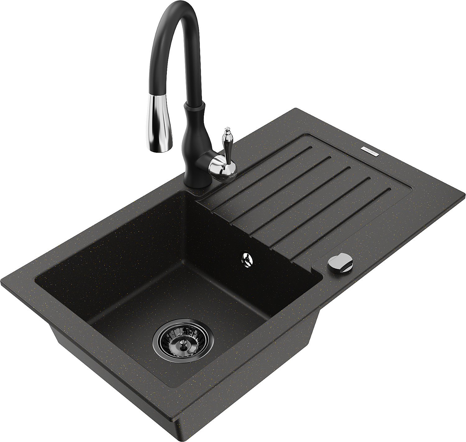 Mexen Pablo granitový dřez s 1 komorou a odkapávačem a kuchyňskou baterií Savita, černý/zlatý metalik - 6510-75-672601-70-B