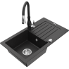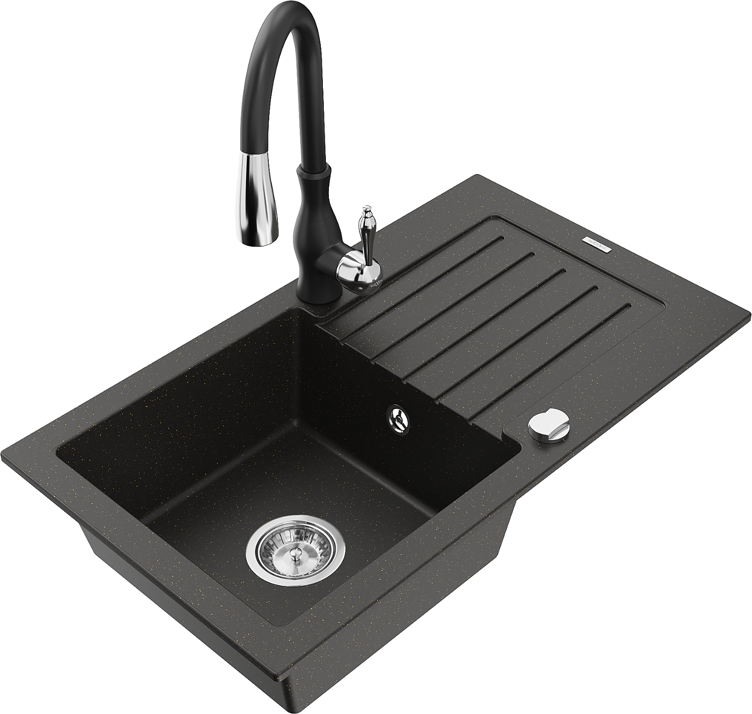 Mexen Pablo granitový dřez 1-komorový s odkapávačem a kuchyňskou baterií Savita, černý/zlatý metalik - 6510-75-672601-70