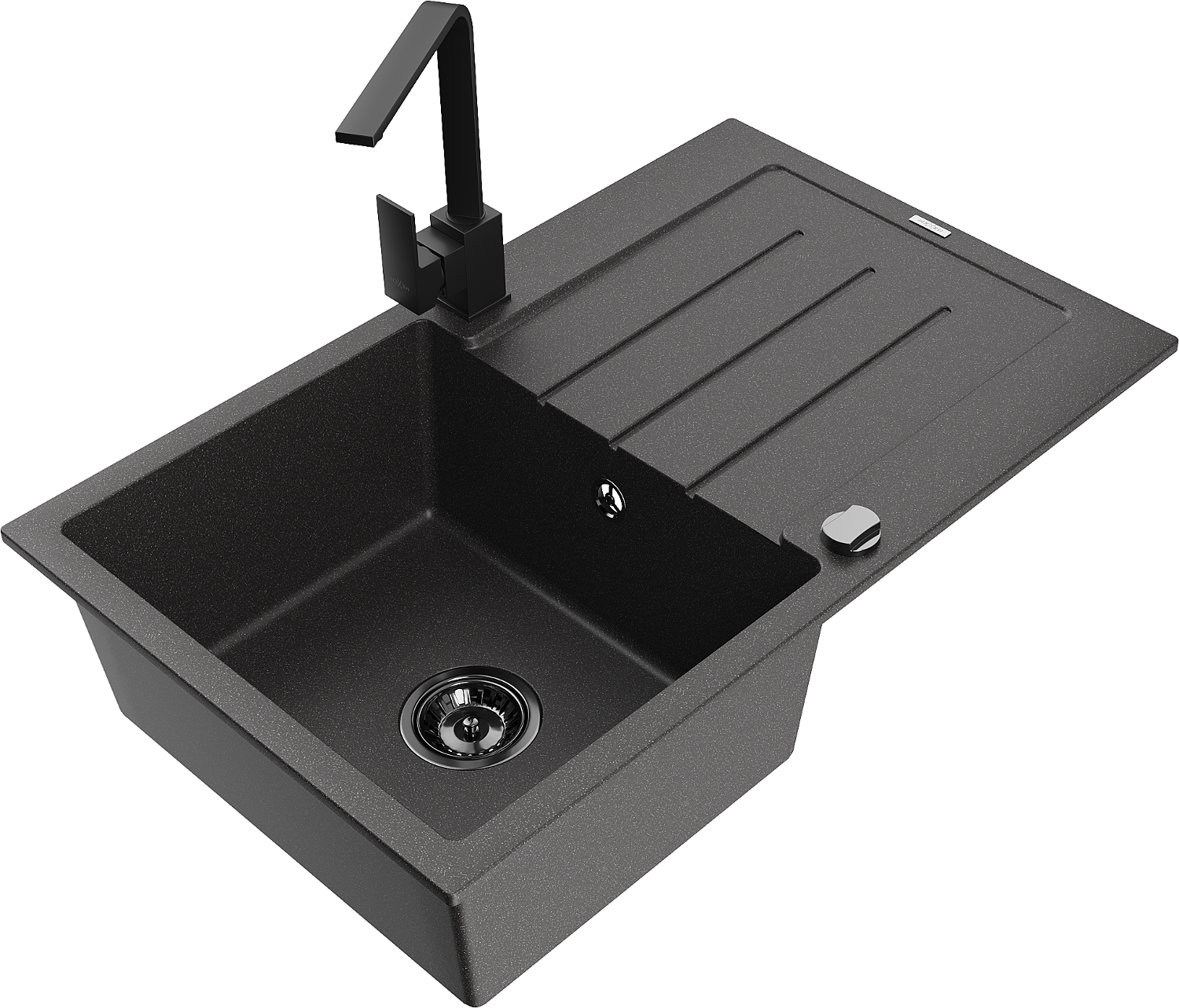 Mexen Bruno granitový dřez s jednou komorou a odkapávačem a kuchyňskou baterií Rita, černý s tečkami - 6513-76-670300-70-B