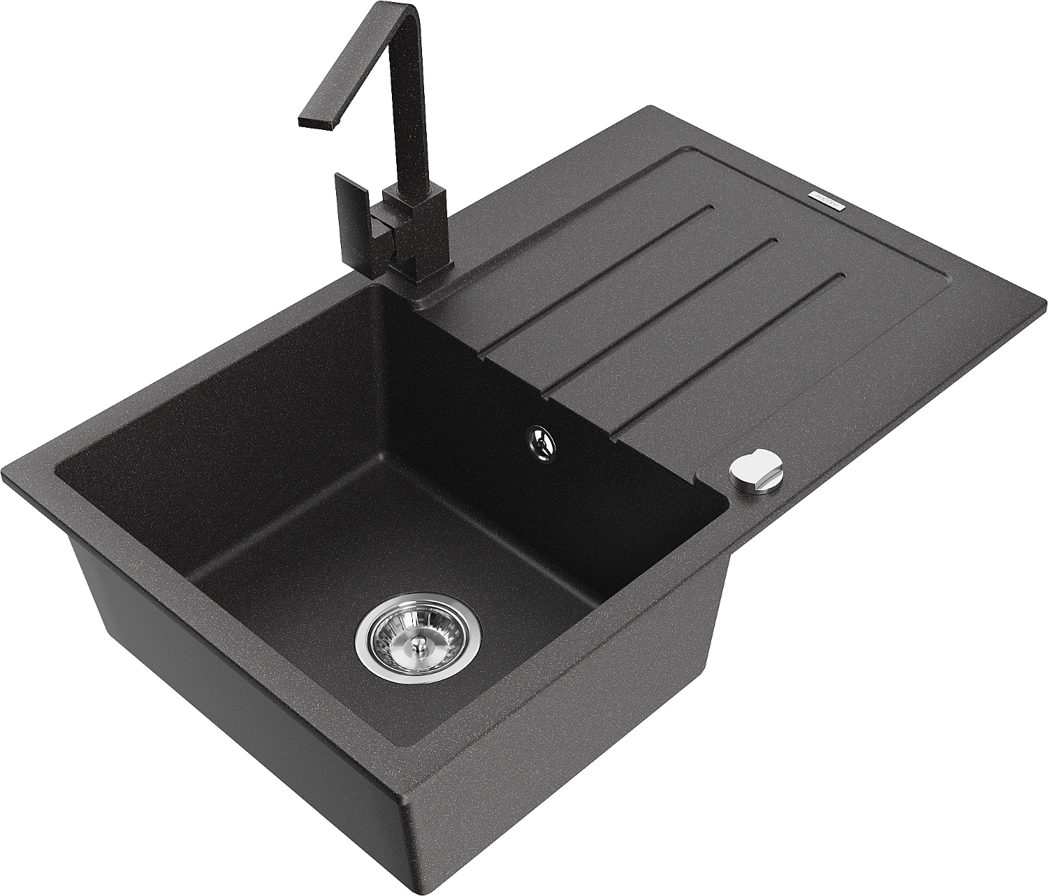 Mexen Bruno granitový dřez 1-komorový s odkapávačem a kuchyňskou baterií Rita, černý tečkovaný - 6513-76-670300-76