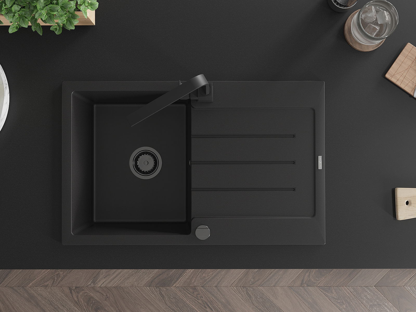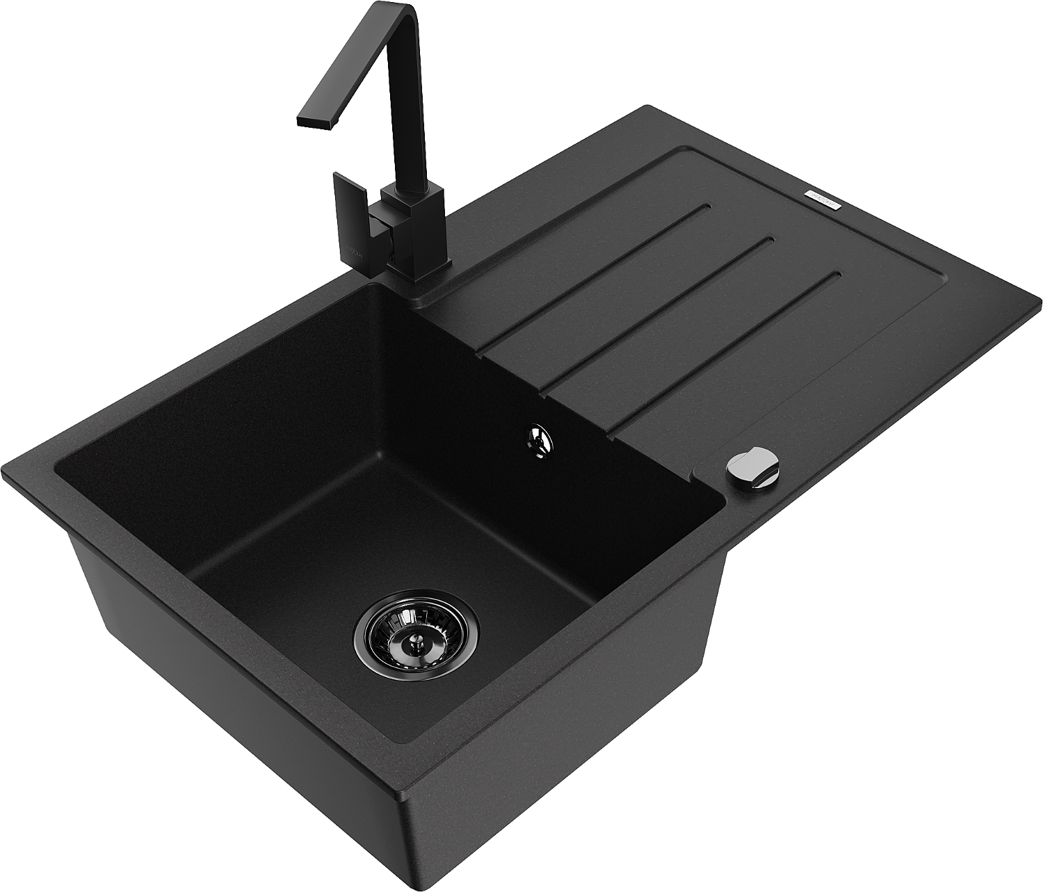 Mexen Bruno granitový dřez 1-komorový s odkapávačem a kuchyňskou baterií Rita, černý - 6513-77-670300-70-B