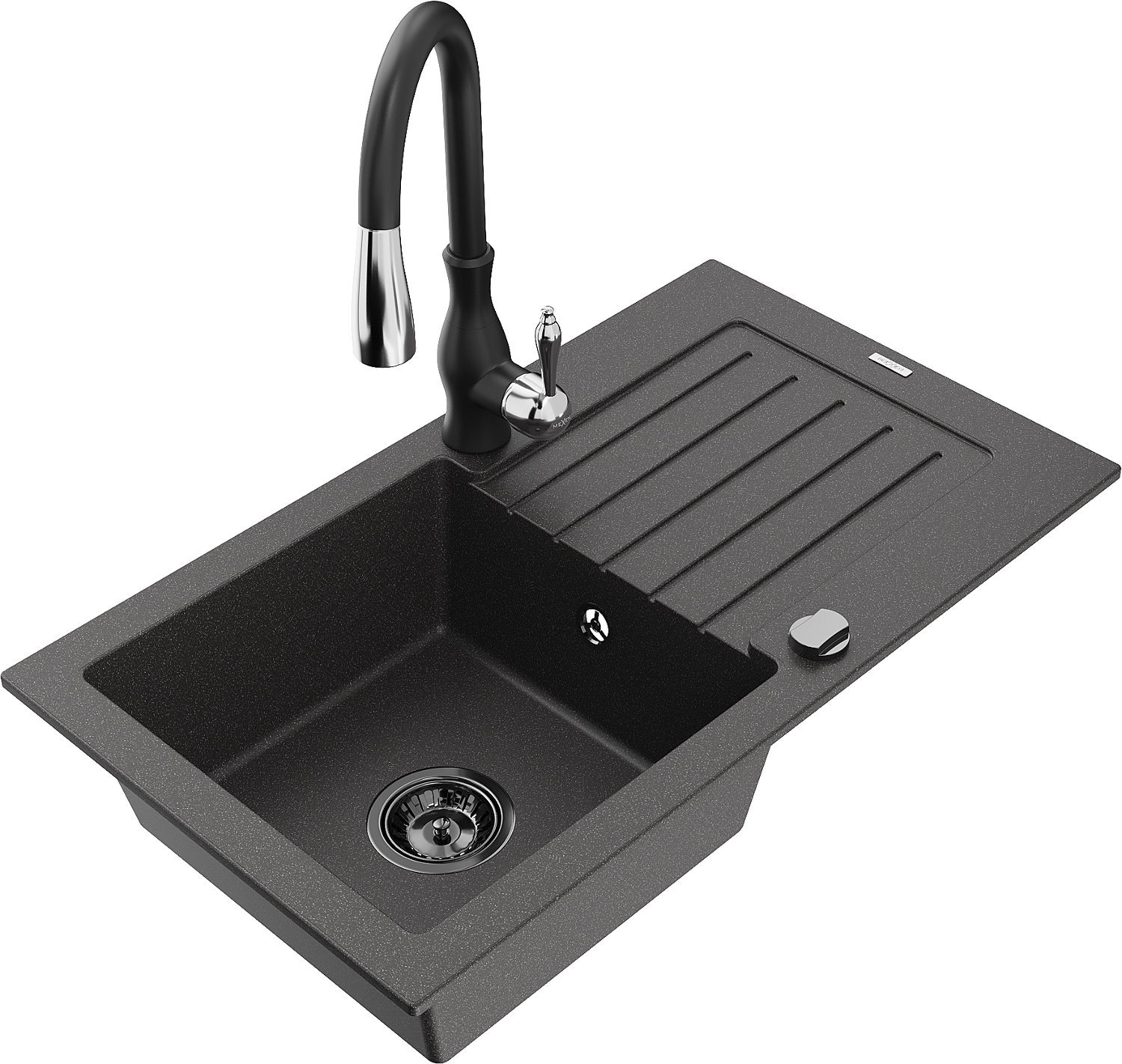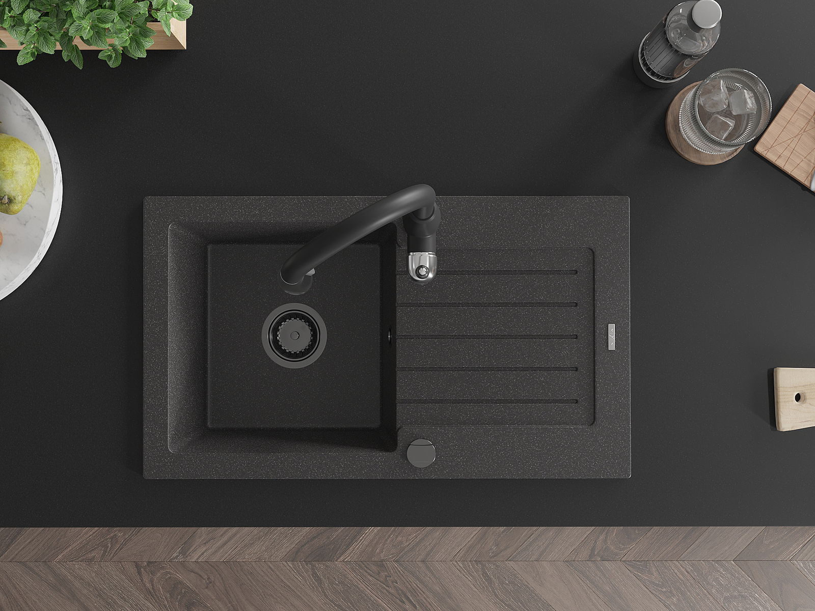 Mexen Pablo granitový dřez, 1-komorový s odkapávačem a kuchyňskou baterií Savita, černý kropenatý - 6510-76-672601-70-B