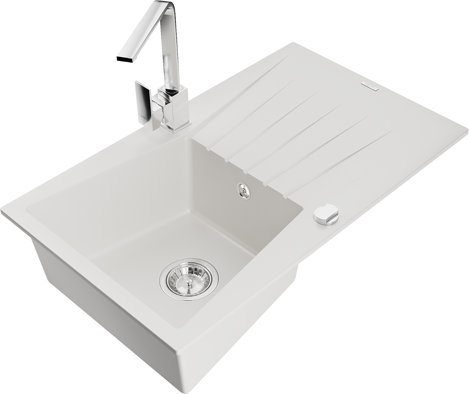 Mexen Cesar granitový dřez 1-komorový s odkapávačem a kuchyňskou baterií Rita, bílý - 6514-20-670300-00