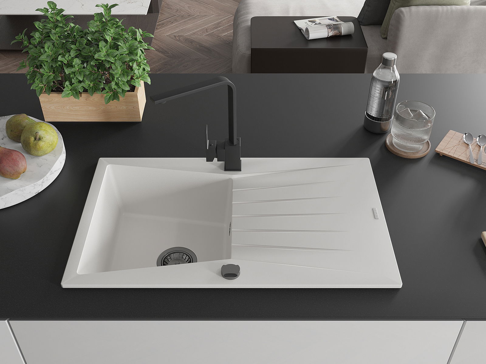 Mexen Cesar granitový dřez 1-komorový s odkapávačem a kuchyňskou baterií Rita, bílý - 6514-20-670300-70