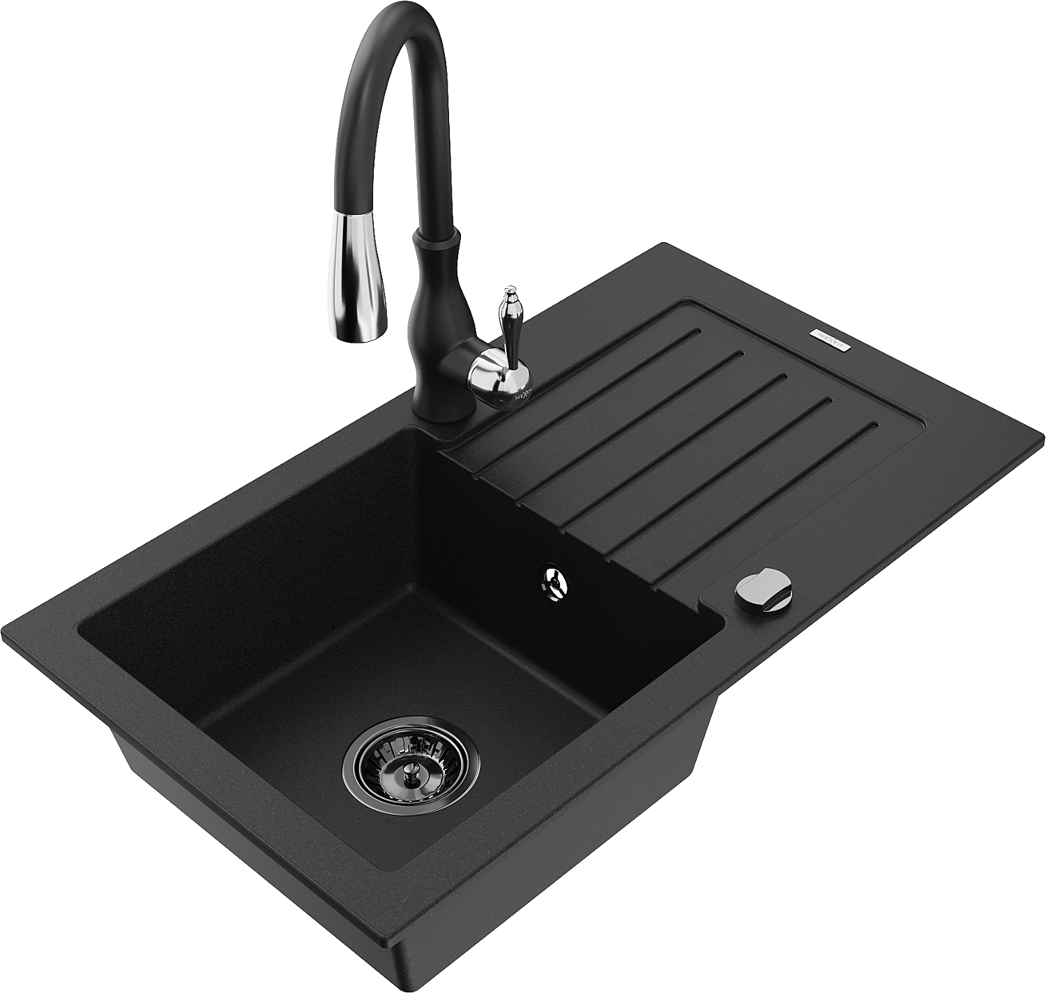 Mexen Pablo granitový dřez 1-komorový s odkapávačem a kuchyňskou baterií Savita, černý - 6510-77-672601-70-B