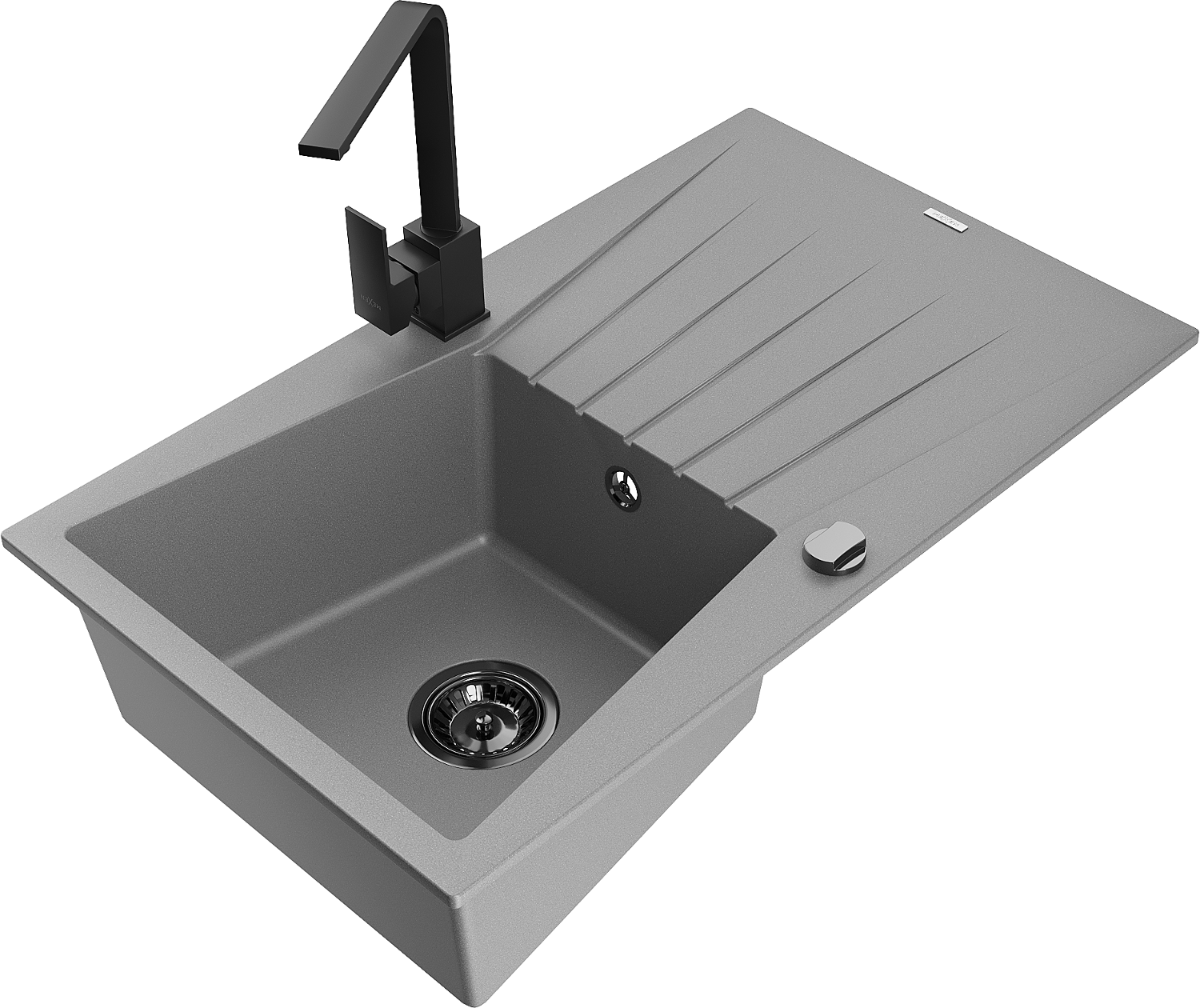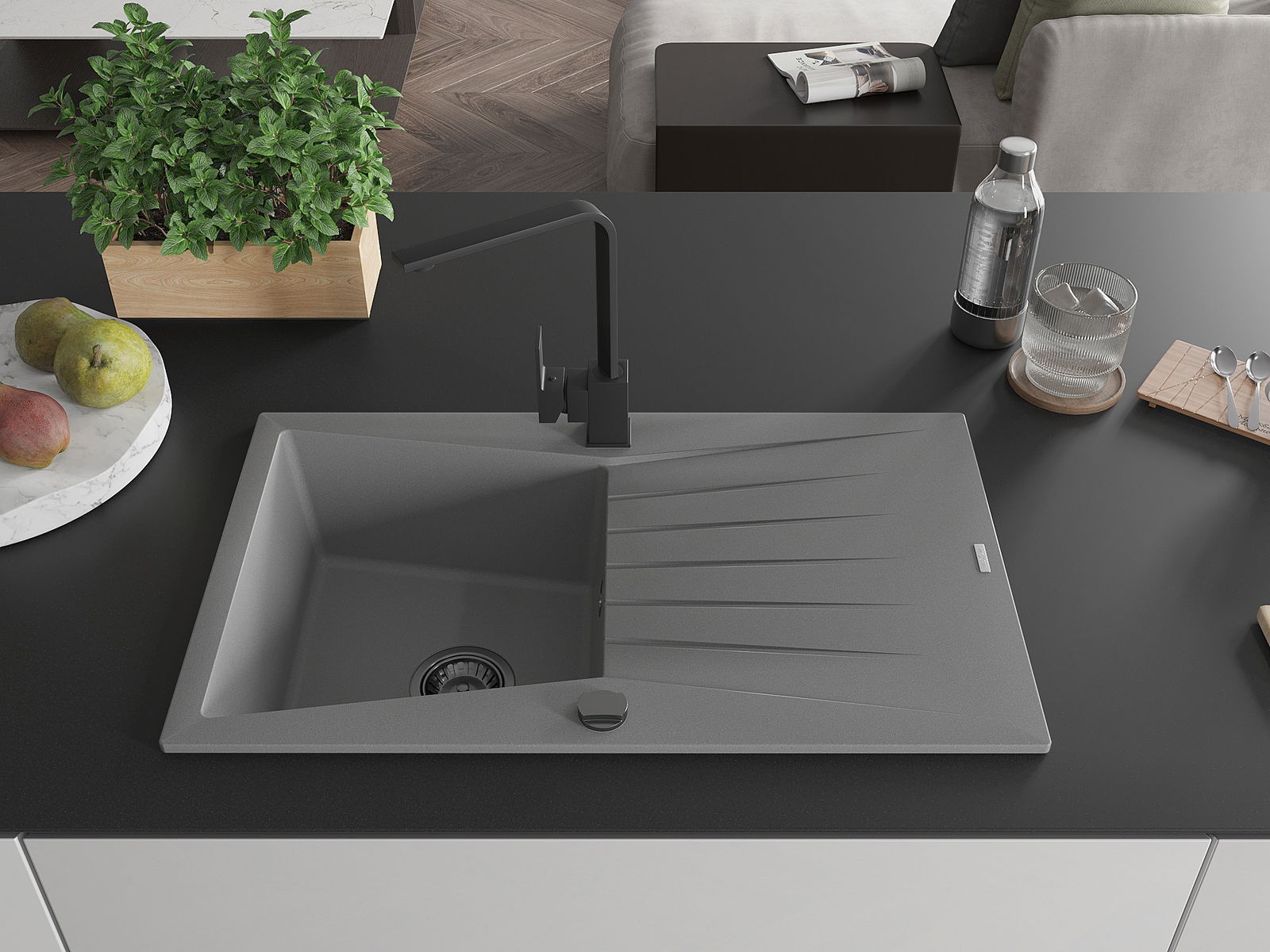Mexen Cesar granitový dřez 1-komorový s odkapávačem a kuchyňskou baterií Rita, šedý - 6514-71-670300-70-B