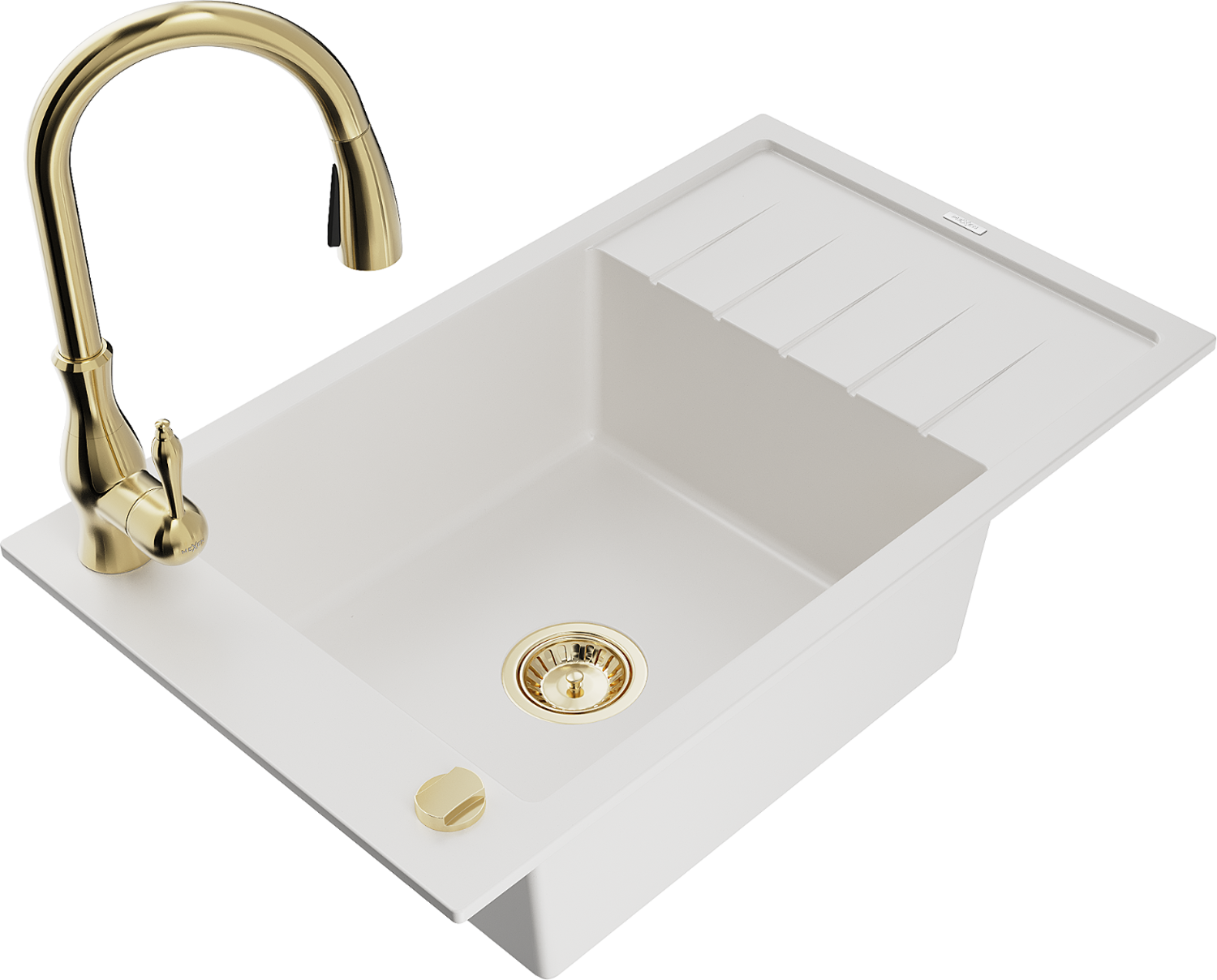 Mexen Elias granitový dřez 1-komorový s odkapávačem a kuchyňskou baterií Savita, bílý - 6511-20-672601-50