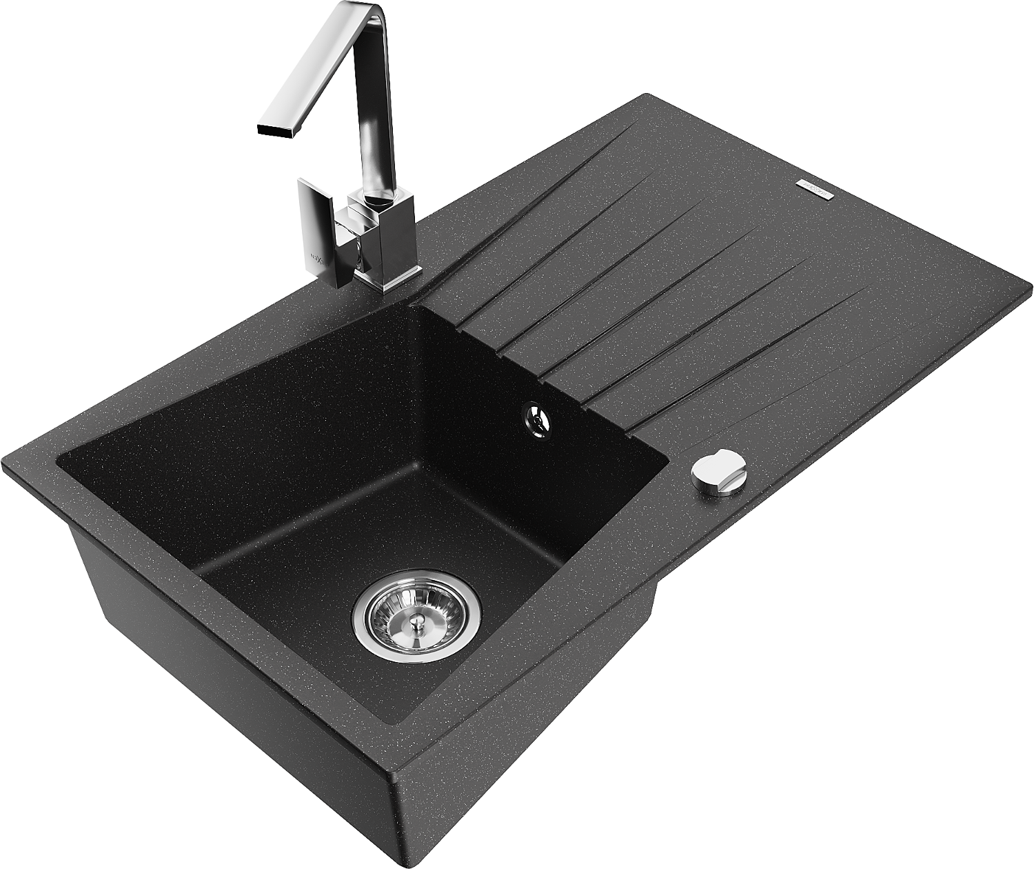 Mexen Cesar granitový dřez jednodřez s odkapávačem a kuchyňskou baterií Rita, černý/stříbrný metalik - 6514-73-670300-00