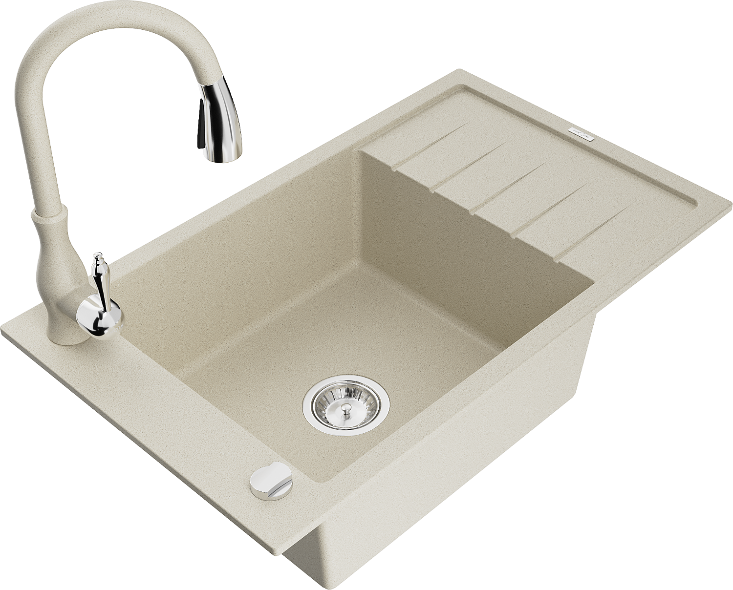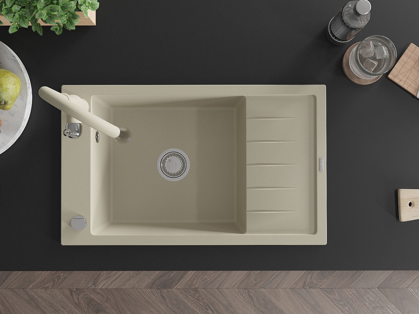 Mexen Elias granitový dřez 1-komorový s odkapávačem a kuchyňskou baterií Savita, béžový - 6511-69-672601-69
