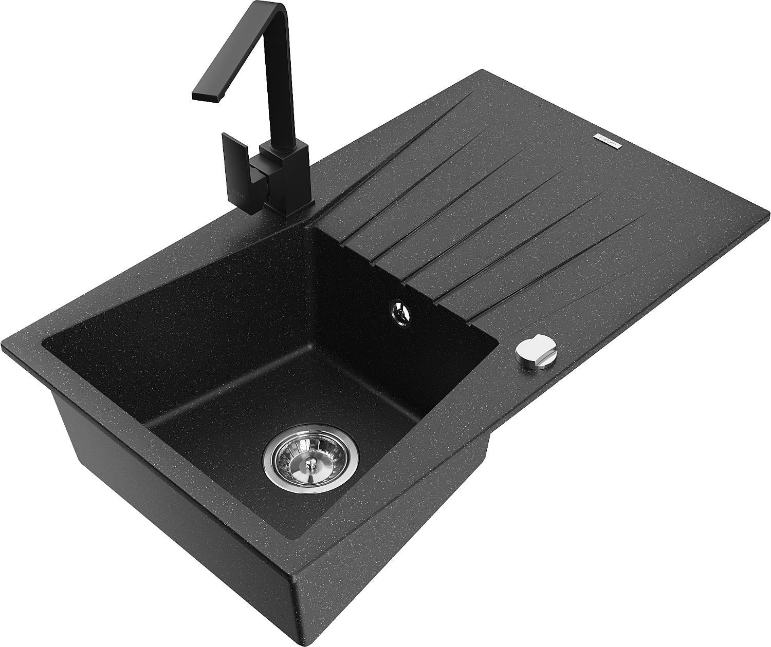 Mexen Cesar granitový dřez s 1-komorou s odkapávačem a kuchyňskou baterií Rita, černý/stříbrný metalický - 6514-73-670300-70