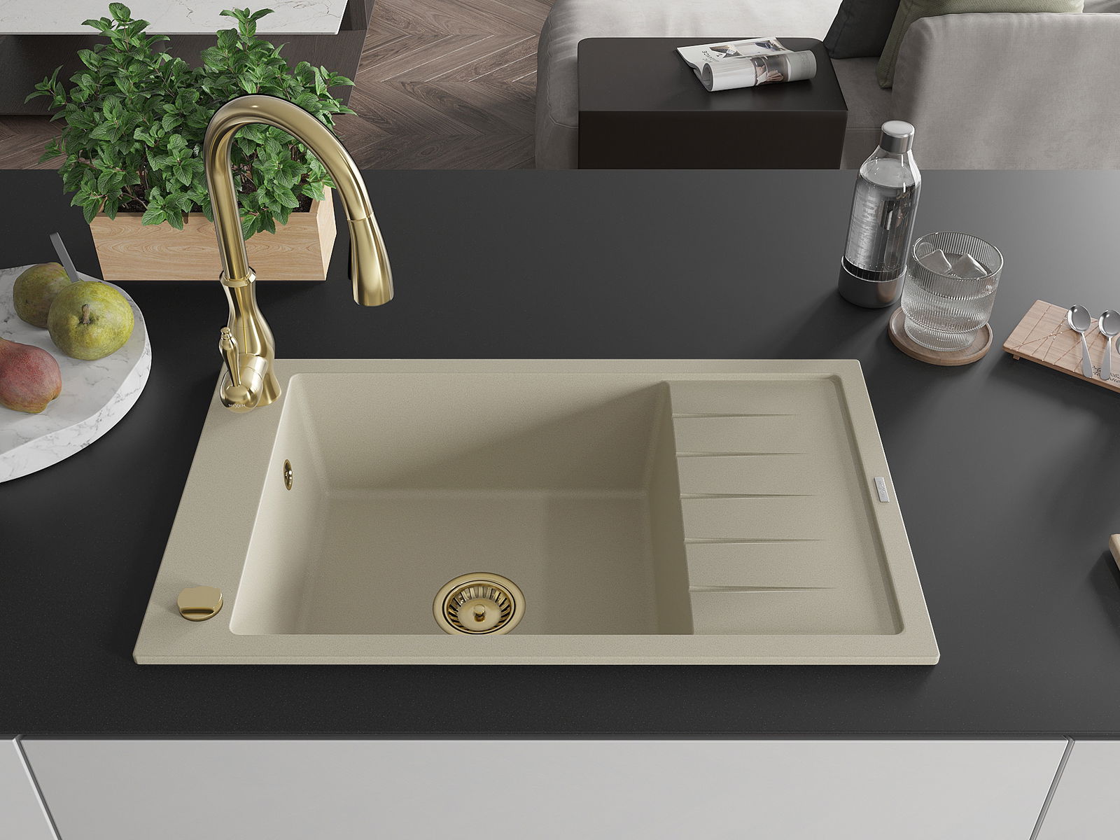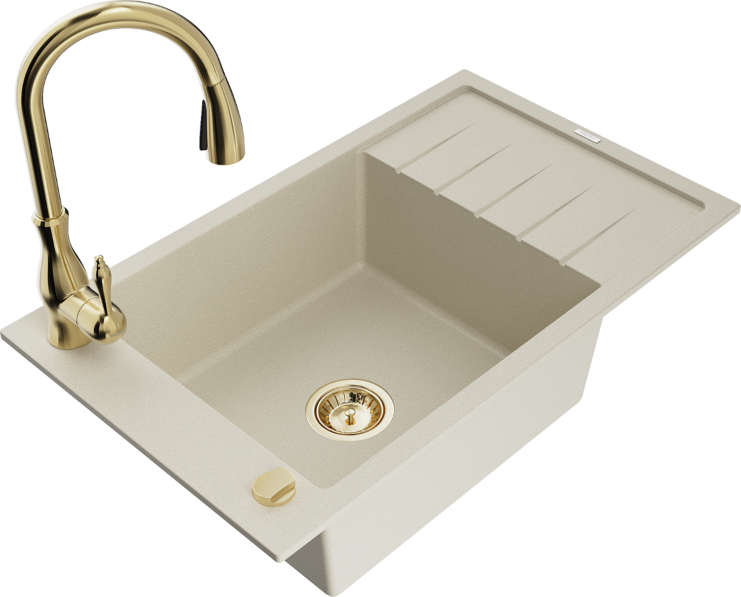 Mexen Elias granitový dřez 1-komorový s odkapávačem a kuchyňskou baterií Savita, béžový - 6511-69-672601-50