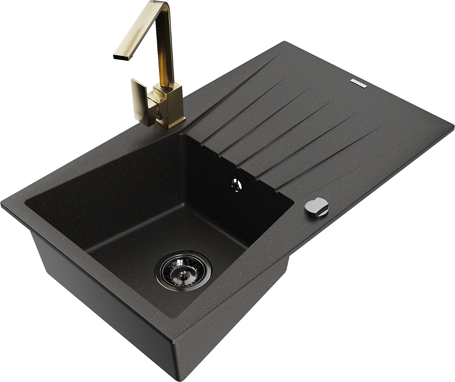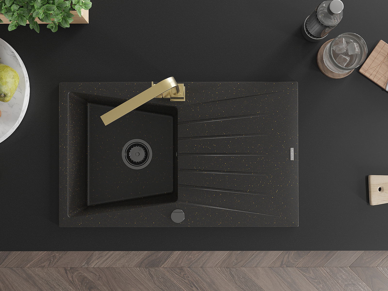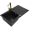 Mexen Cesar žulový dřez s 1 komorou s odkapávačem a kuchyňskou baterií Rita, černý/zlatý metalik - 6514-75-670300-50-B