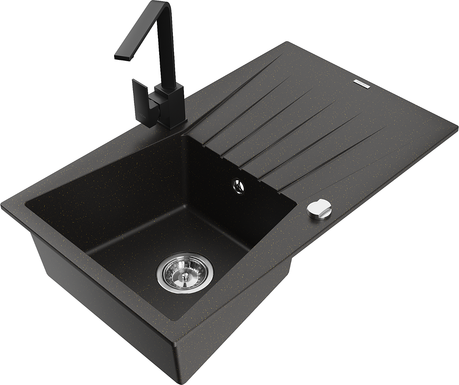 Mexen Cesar granitový dřez 1-komorový s odkapávačem a kuchyňskou baterií Rita, černý/zlatý metalik - 6514-75-670300-70