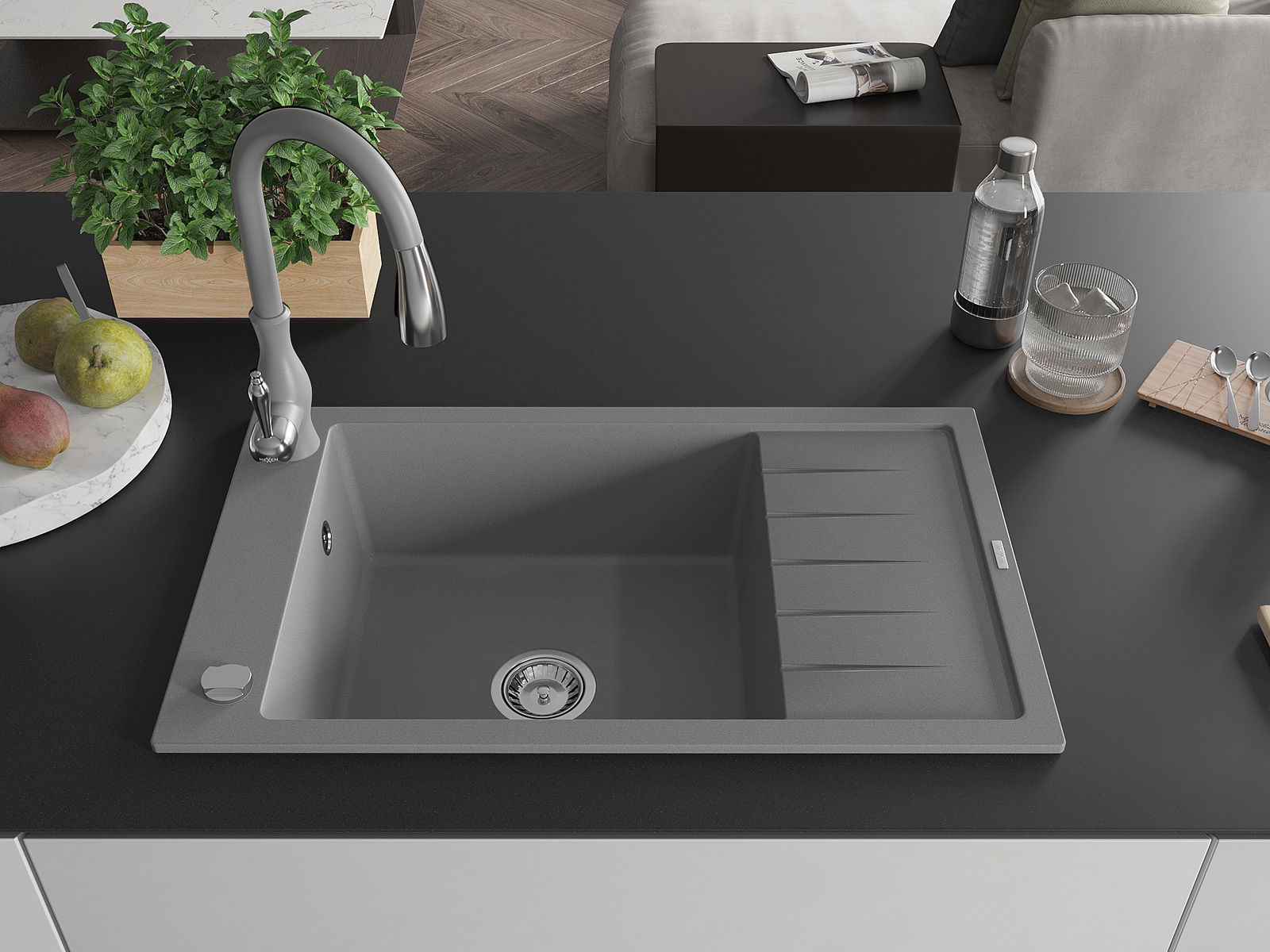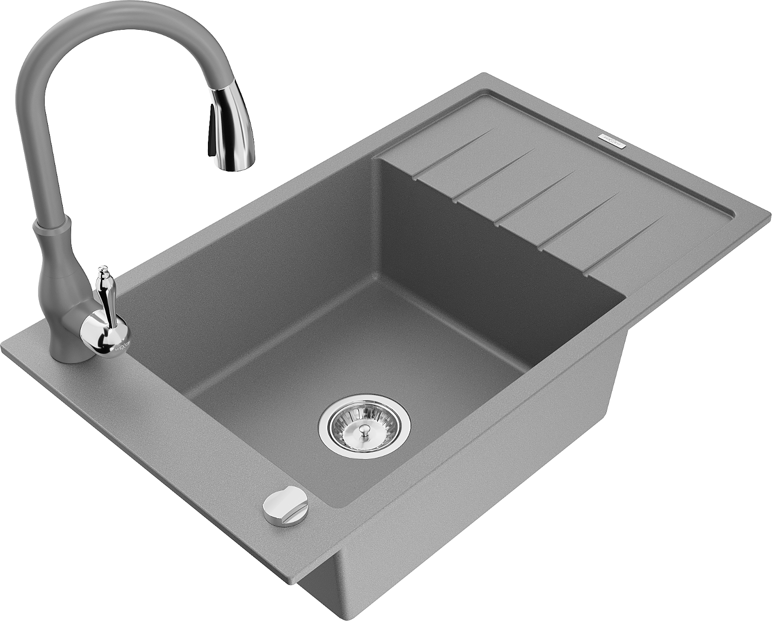 Mexen Elias granitový dřez 1-komorový s odkapávačem a kuchyňskou baterií Savita, šedý - 6511-71-672601-71
