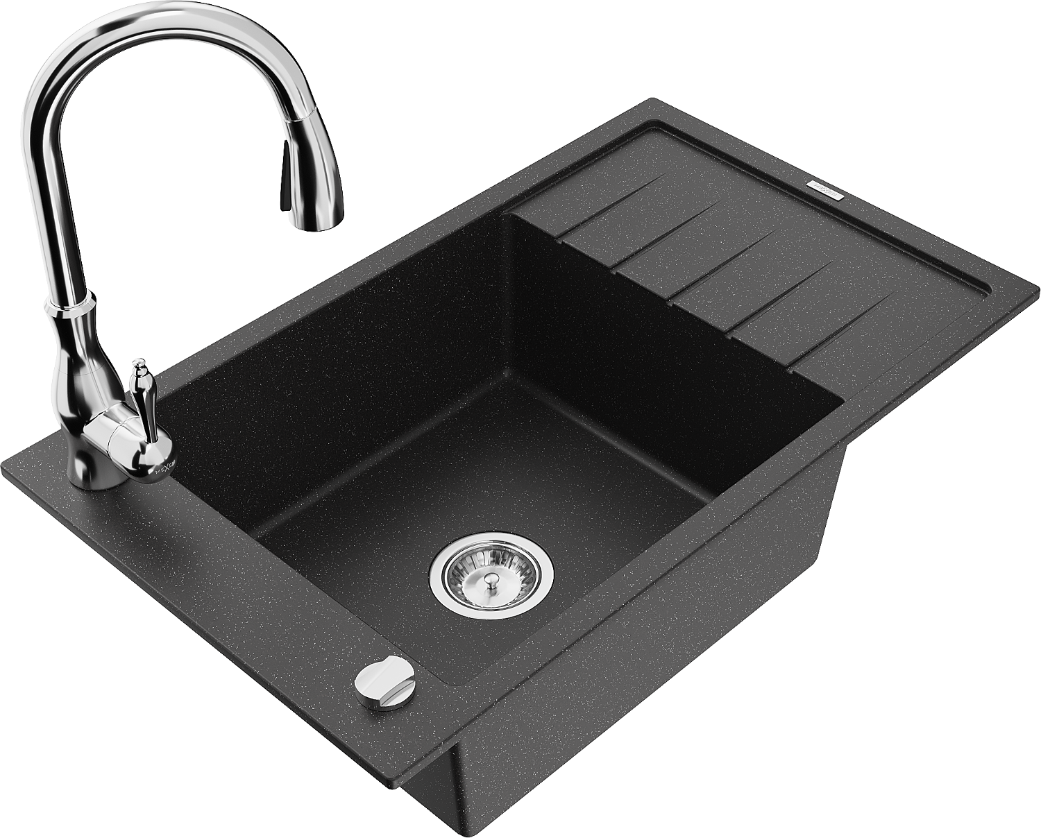 Mexen Elias granitový dřez s 1 komorou a odkapávačem a kuchyňskou baterií Savita, černá/stříbrná metalíza- 6511-73-672601-00