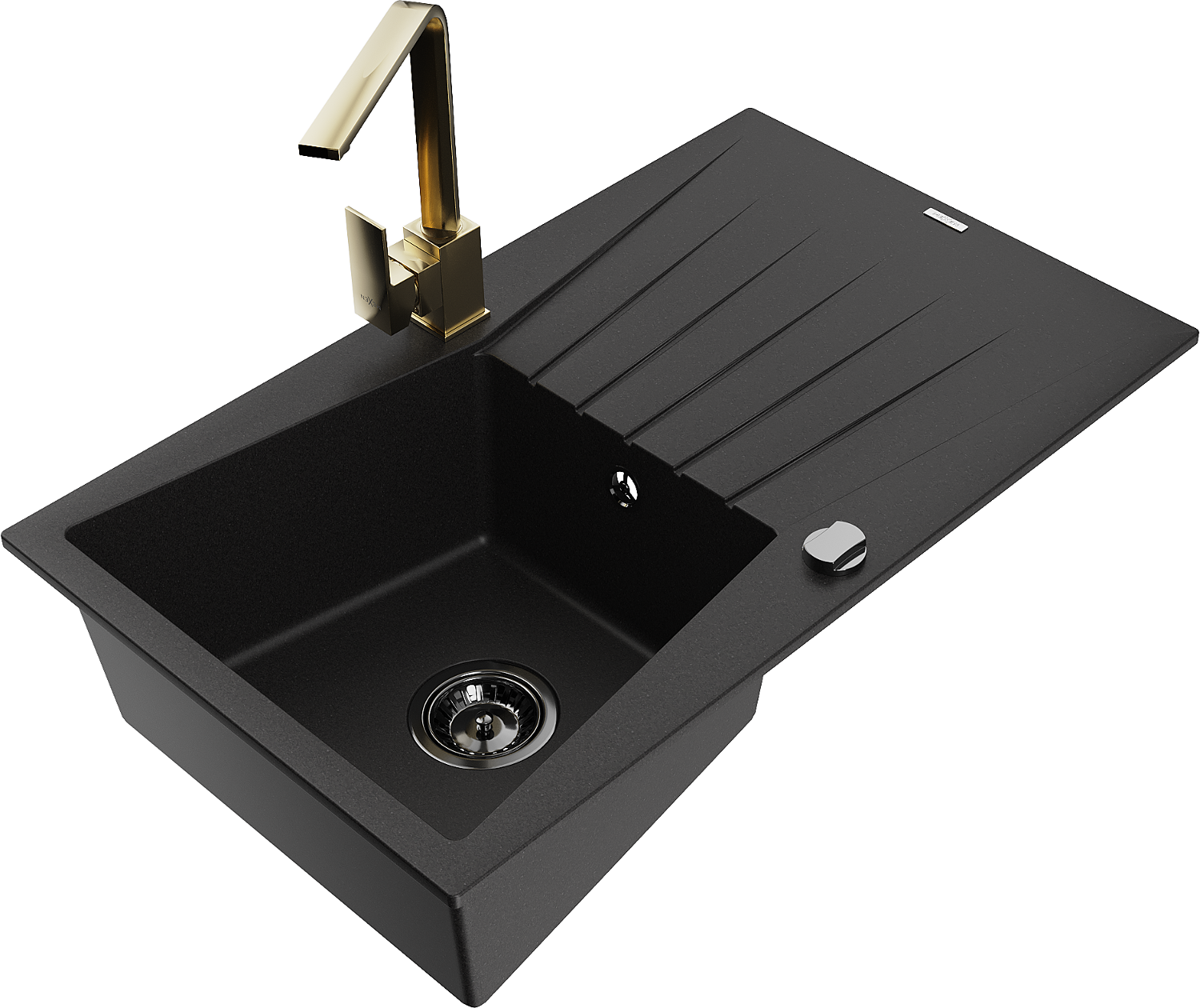 Mexen Cesar granitový dřez 1-komorový s odkapávačem a kuchyňskou baterií Rita, černý - 6514-77-670300-50-B