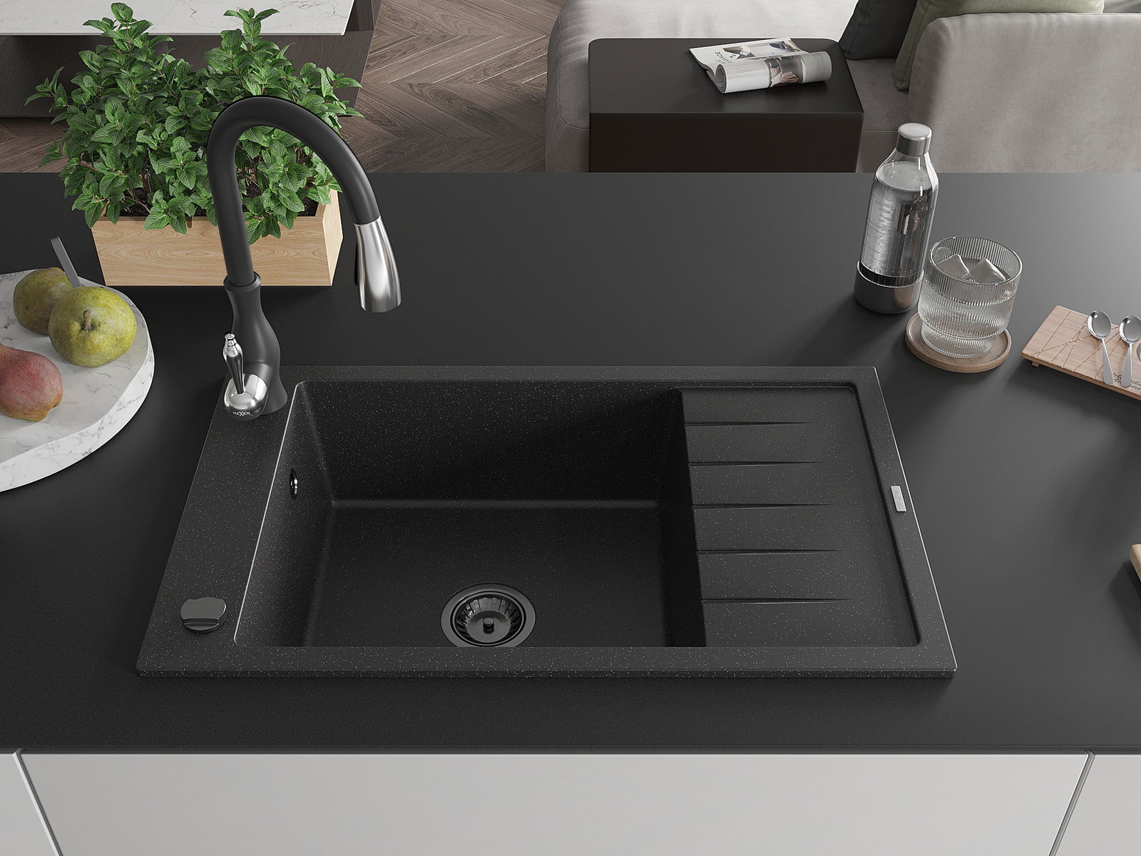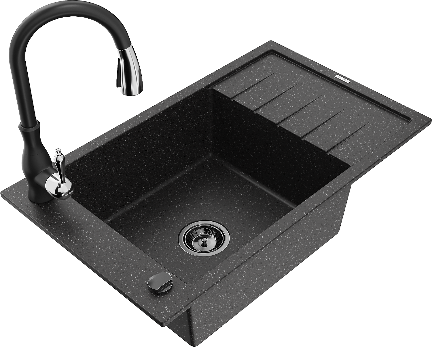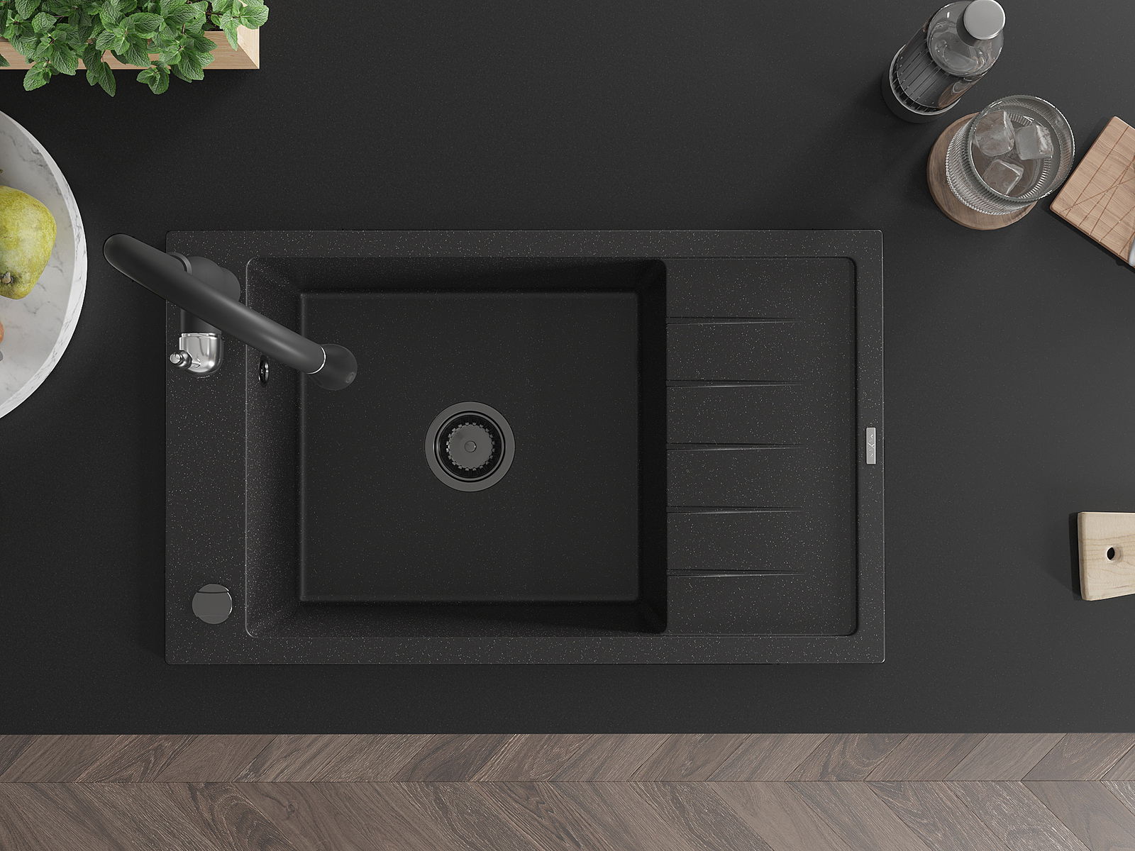 Mexen Elias granitový dřez 1-komorový s odkapávačem a kuchyňskou baterií Savita, černý/stříbrný metalík- 6511-73-672601-70-B