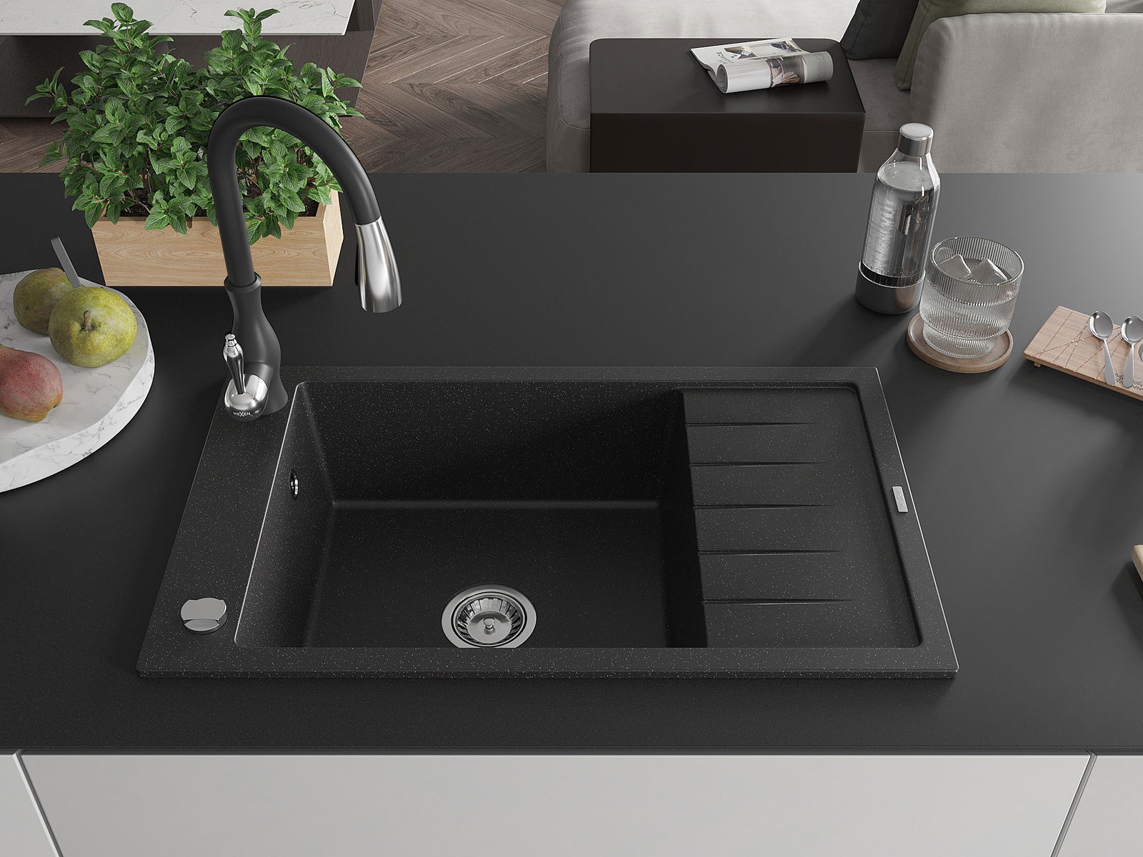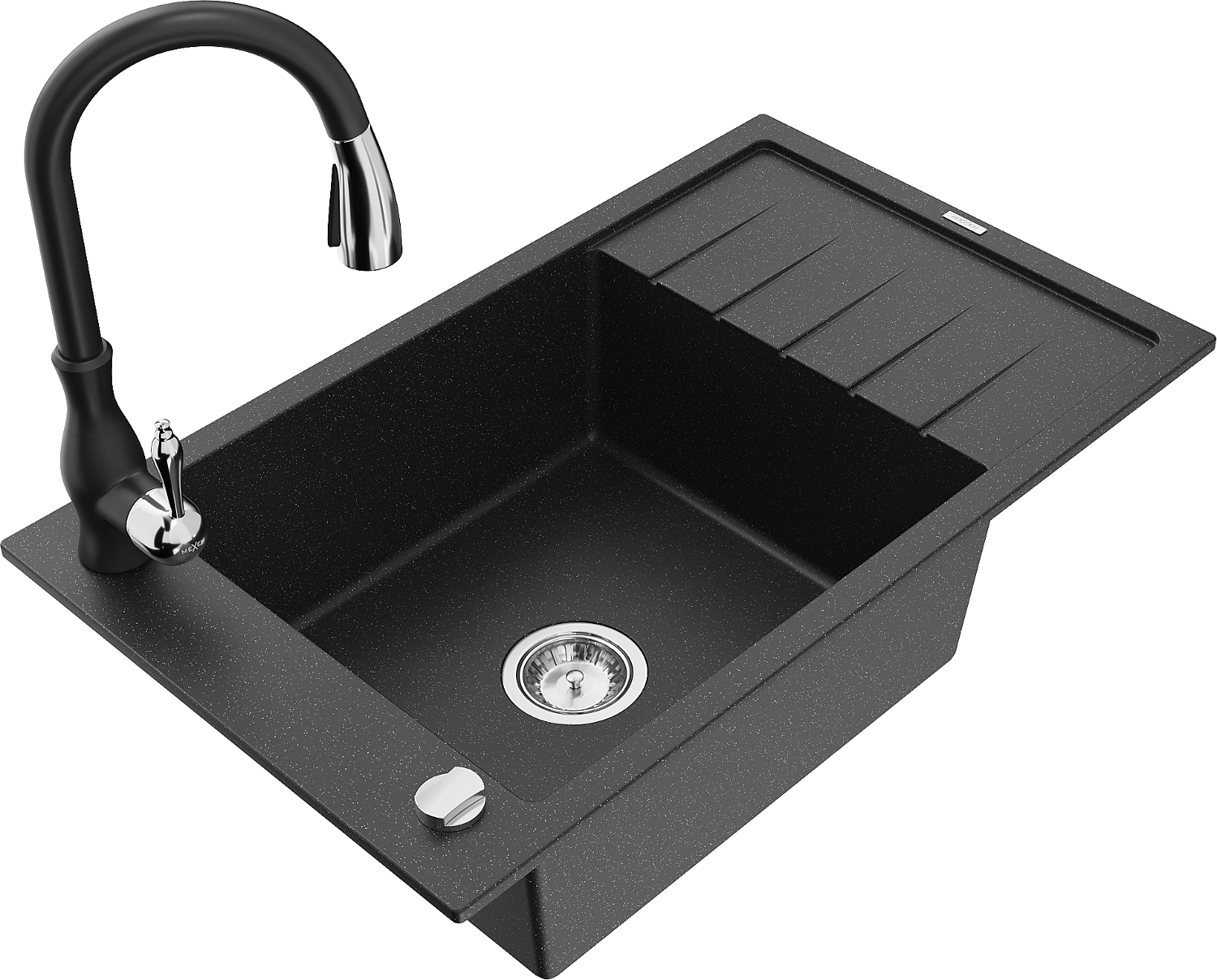 Mexen Elias granitový dřez 1-komorový s odkapávačem a kuchyňskou baterií Savita, černý/stříbrný metalik- 6511-73-672601-70