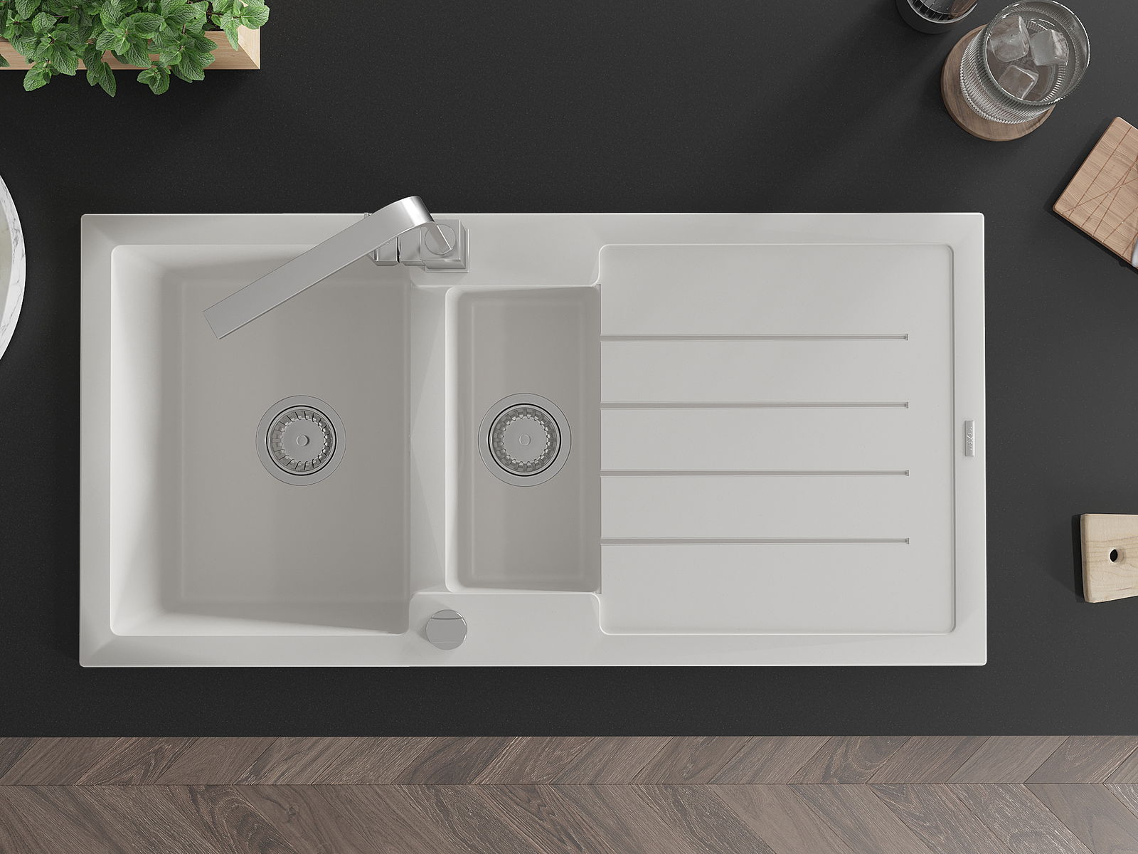 Povrch dřezu je odolný proti skvrnám a zabarvení, což usnadňuje jeho čištění a zachovává jeho barvu po dlouhou dobu používání. Estetický a praktický doplněk každé kuchyně.