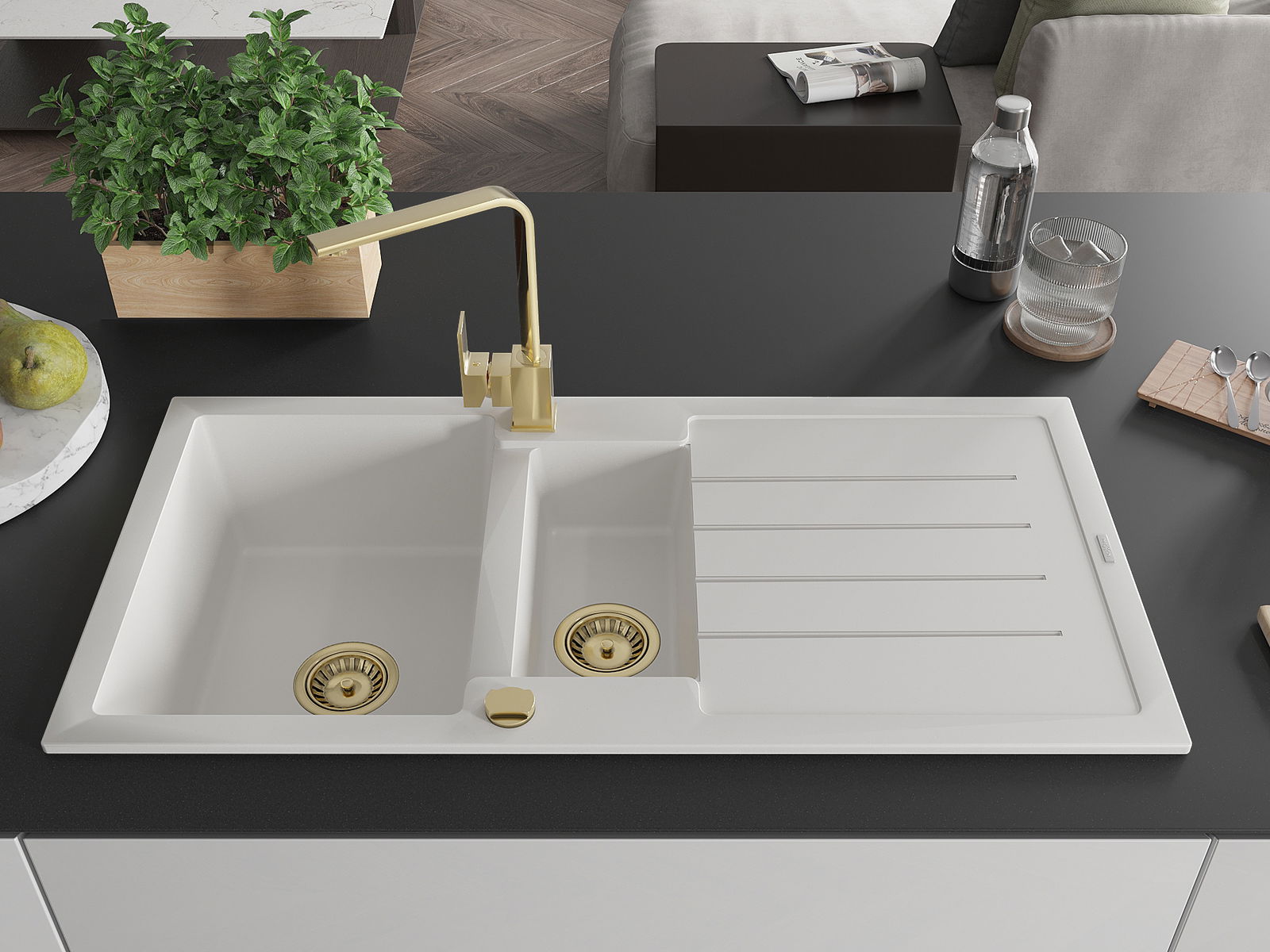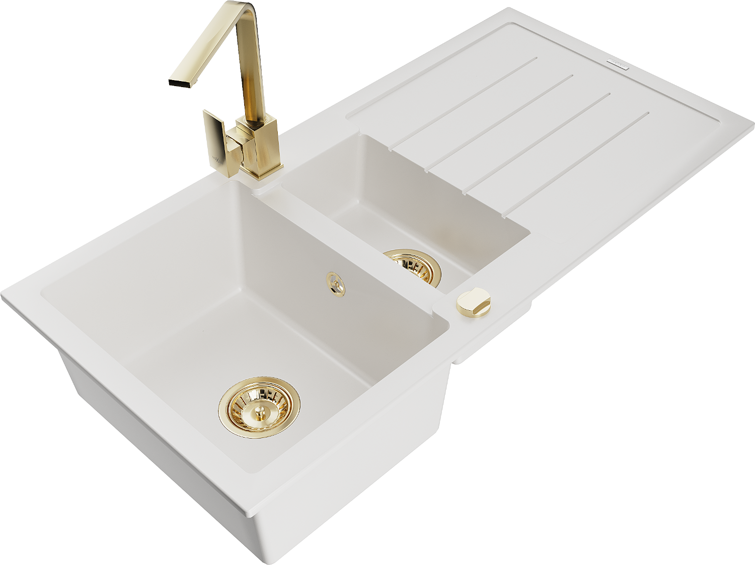 Mexen Andres granitový dřez 1,5-komorový s odkapávačem a kuchyňskou baterií Rita, bílý - 6515-20-670300-50