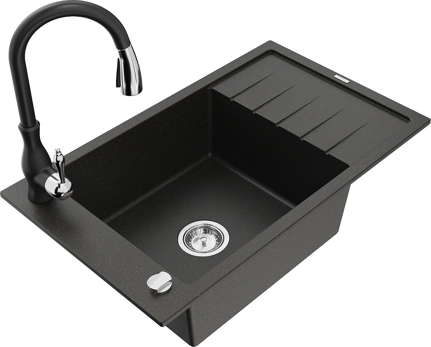 Mexen Elias granitový dřez s 1 komorou, odkapávačem a kuchyňskou baterií Savita, černá/zlatý metalík - 6511-75-672601-70