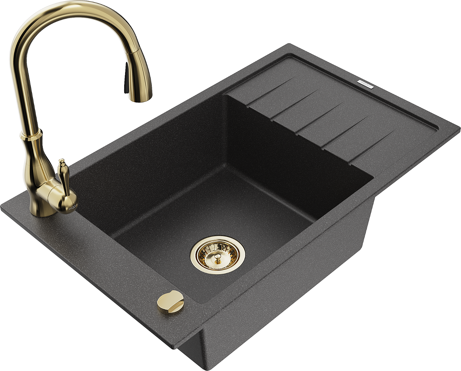 Mexen Elias granitový dřez 1-komorový s odkapávačem a kuchyňskou baterií Savita, černý kropenatý - 6511-76-672601-50