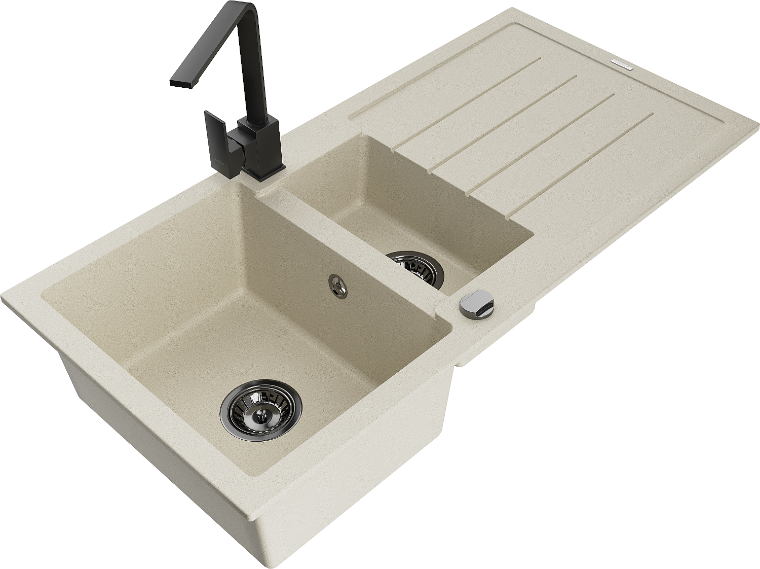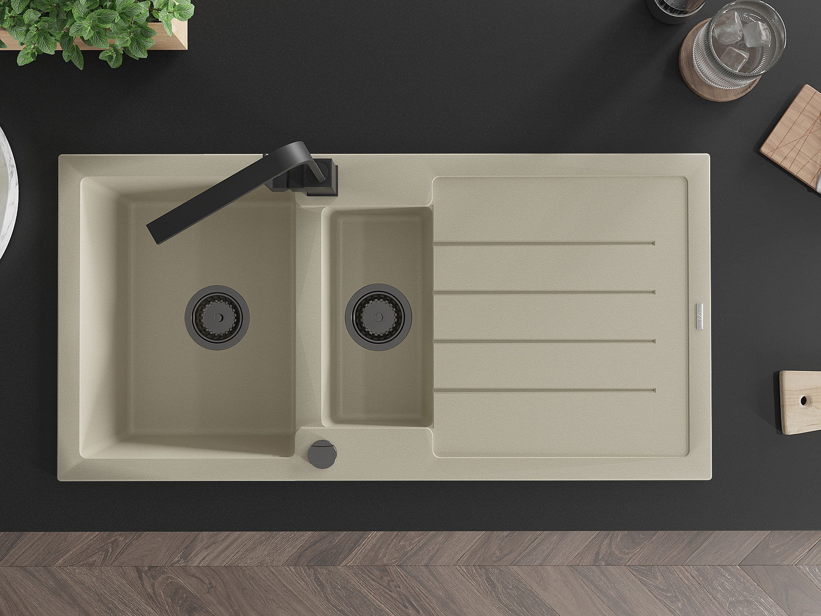 Mexen Andres granitový dřez 1,5-komorový s odkapávačem a kuchyňskou baterií Rita, béžový - 6515-69-670300-70