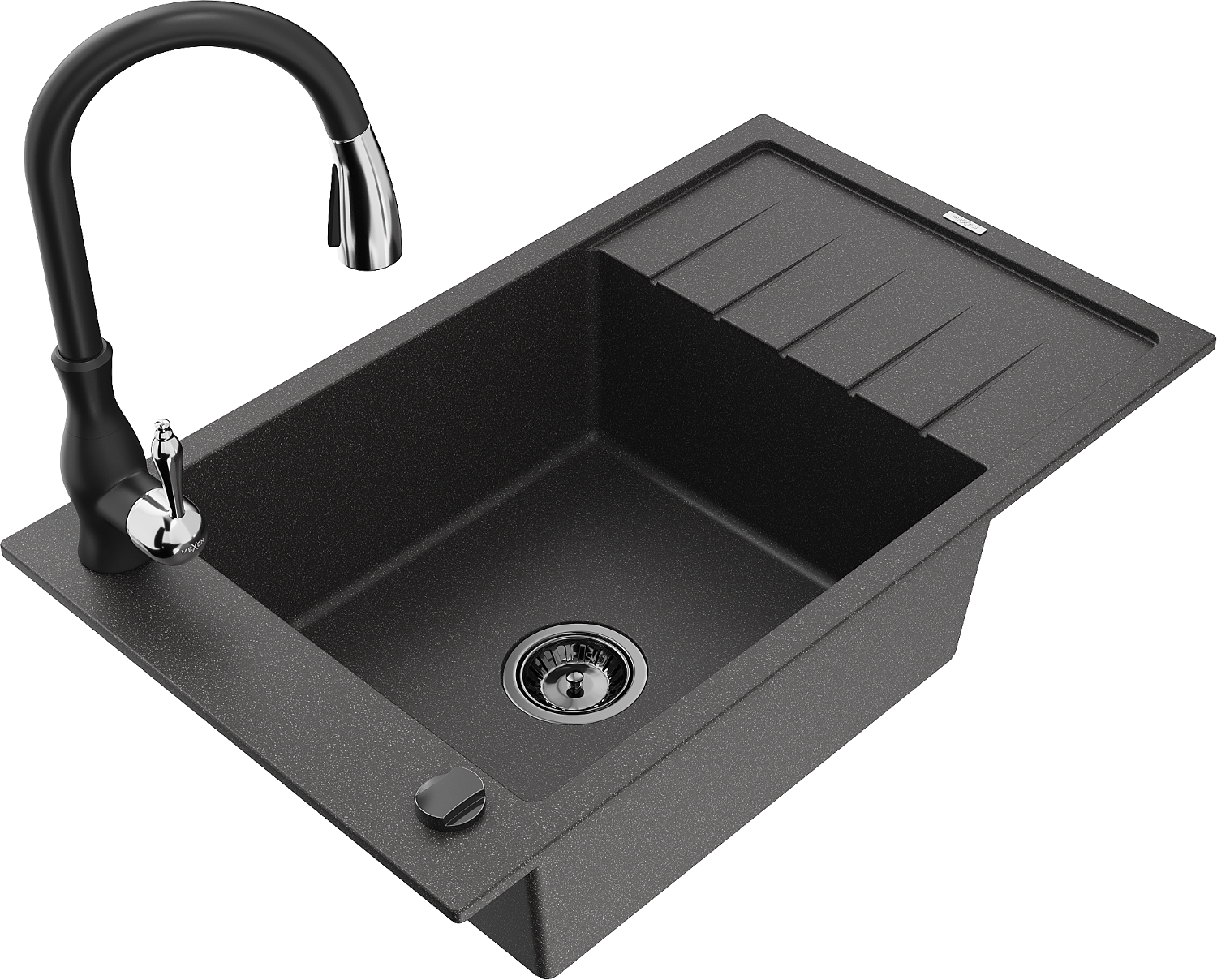 Mexen Elias granitový dřez s 1 komorou, s odkapávačem a kuchyňskou baterií Savita, černý s tečkami - 6511-76-672601-70-B