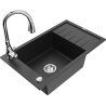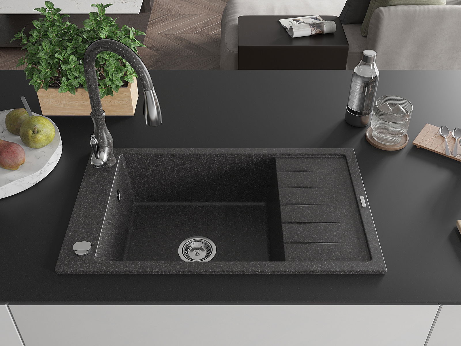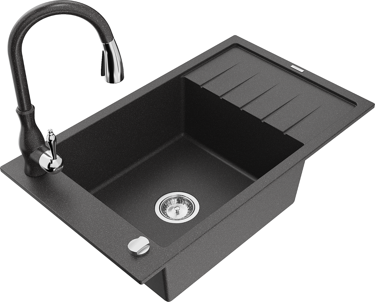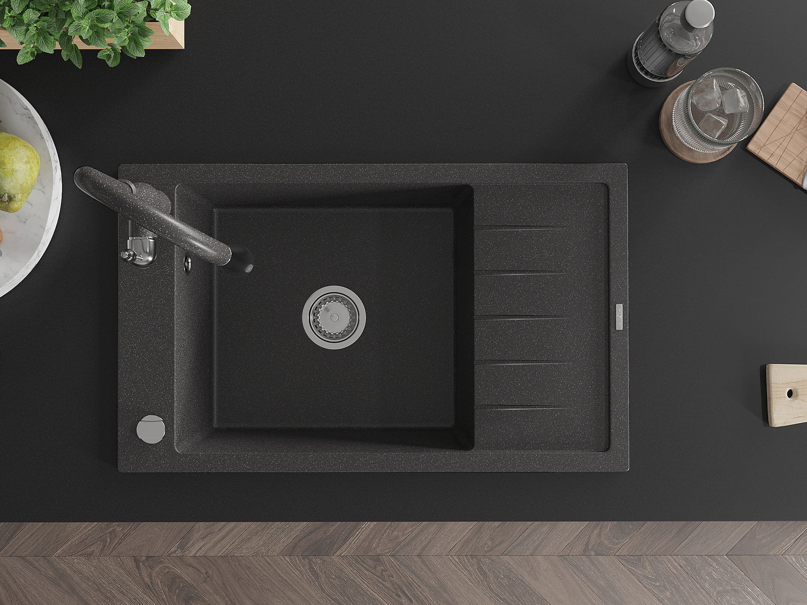 Mexen Elias žulový dřez 1-komorový s odkapávačem a kuchyňskou baterií Savita, černý tečkovaný - 6511-76-672601-76