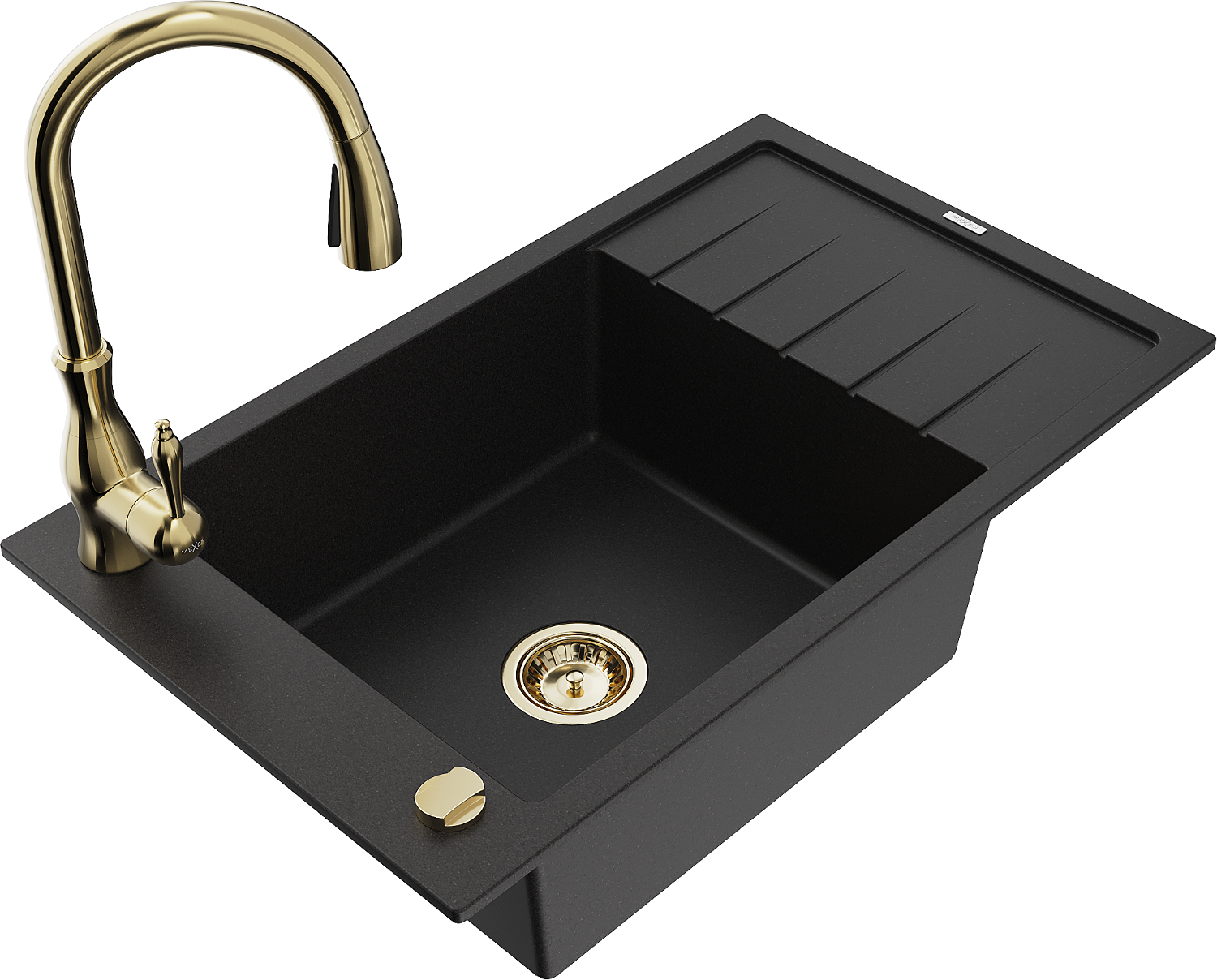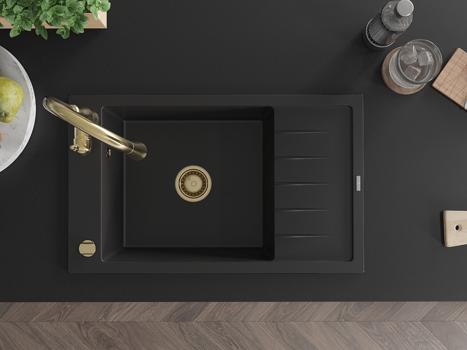 Mexen Elias granitový dřez s 1 komorou a odkapávačem a kuchyňskou baterií Savita, černý - 6511-77-672601-50