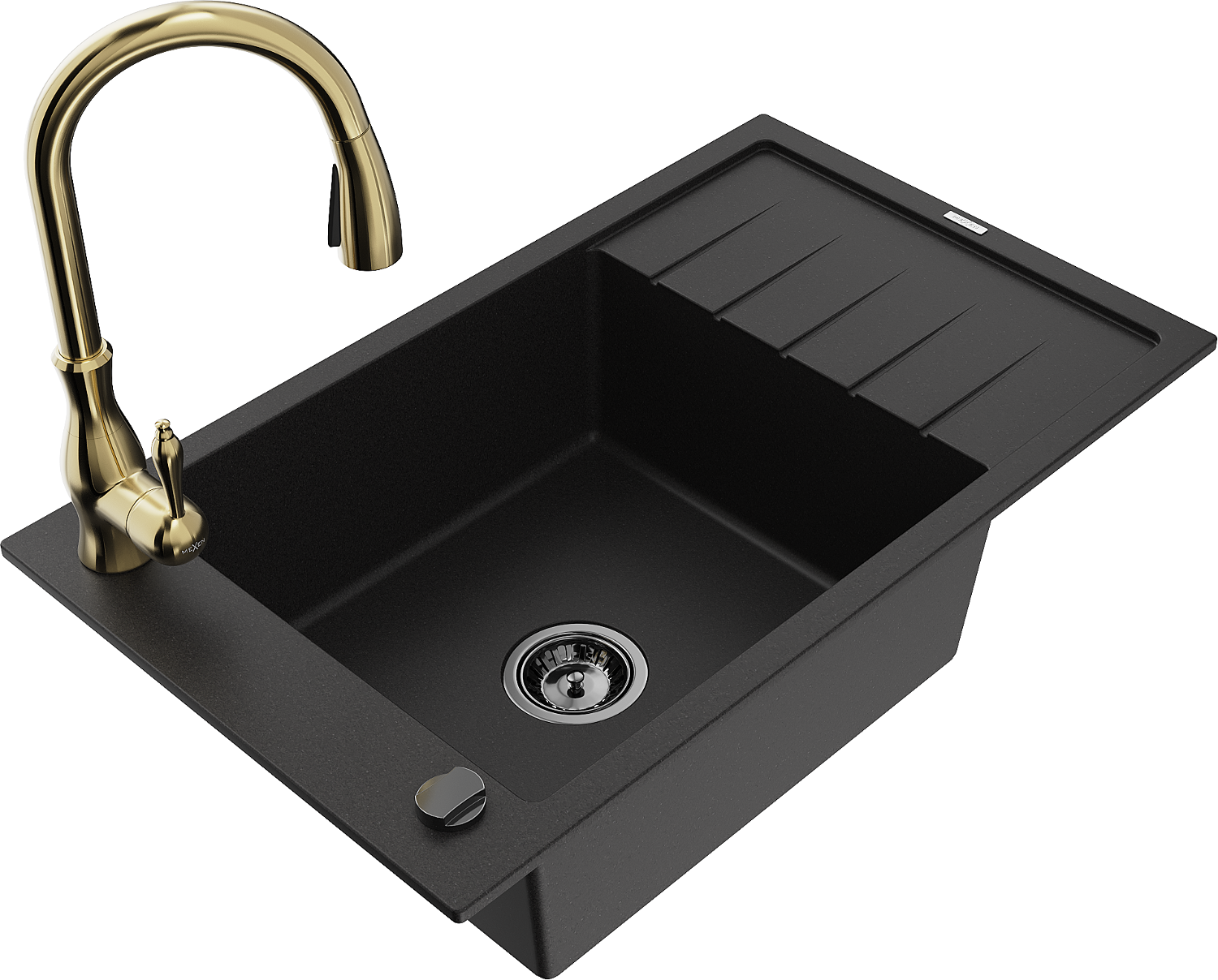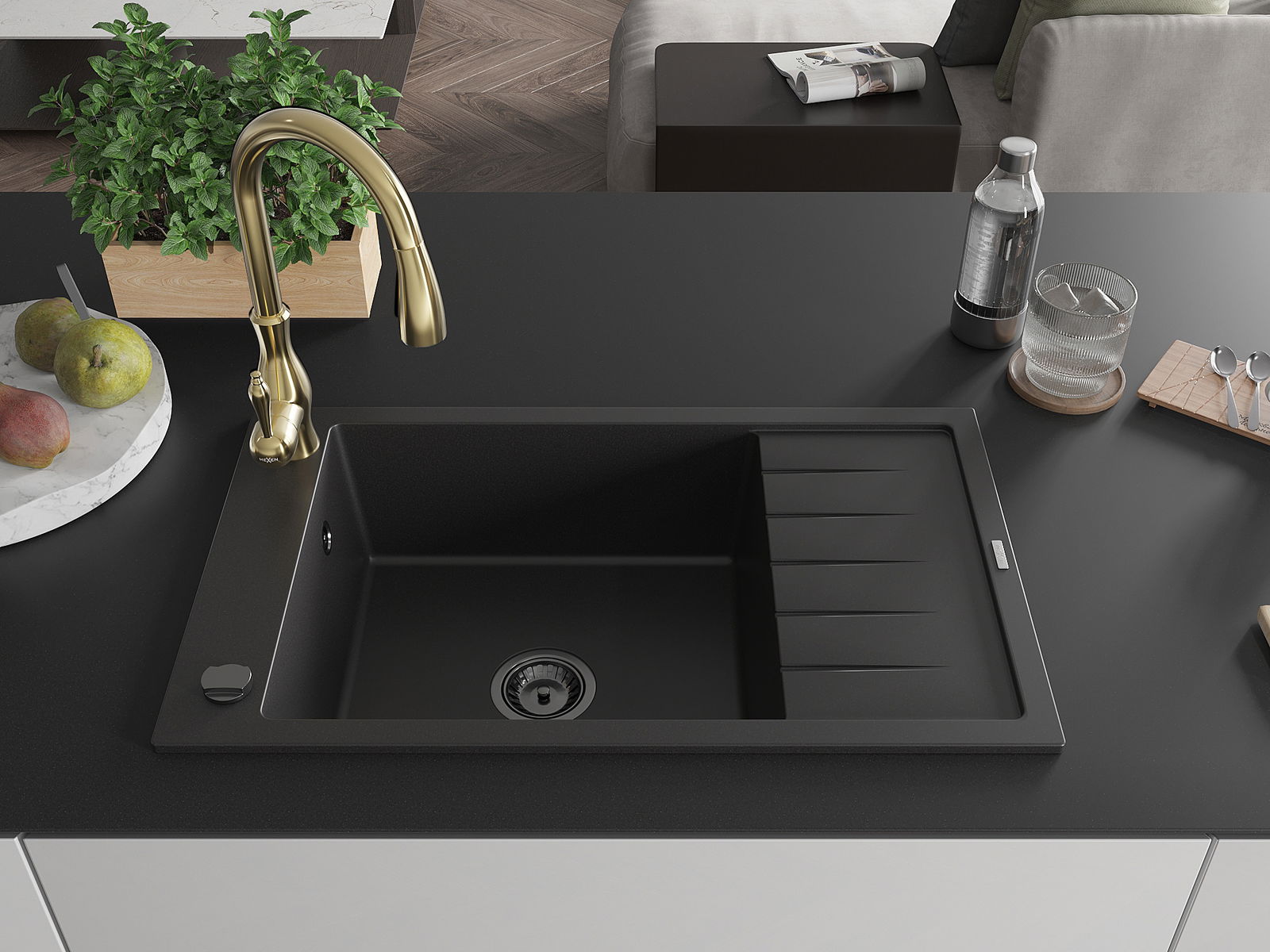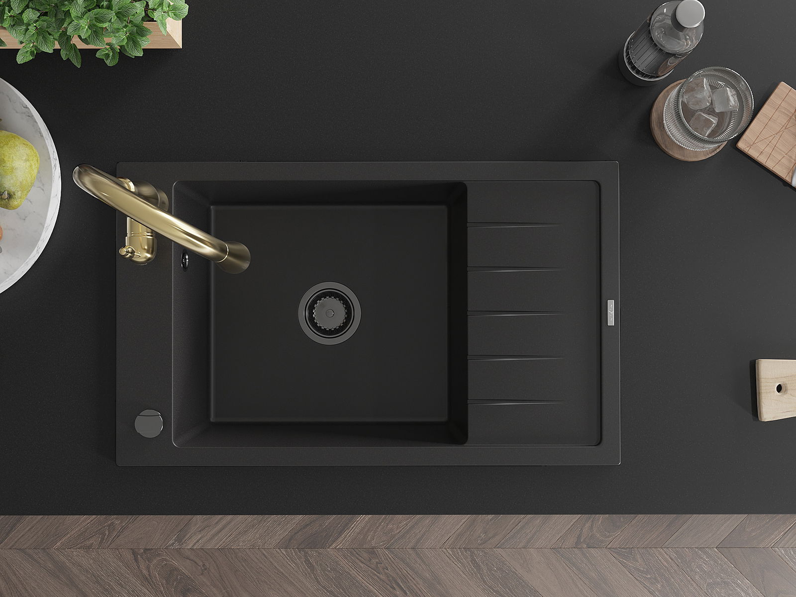 • Mexen Elias granitový dřez 1-komorový s odkapávačem a kuchyňskou baterií Savita, černý - 6511-77-672601-50-B