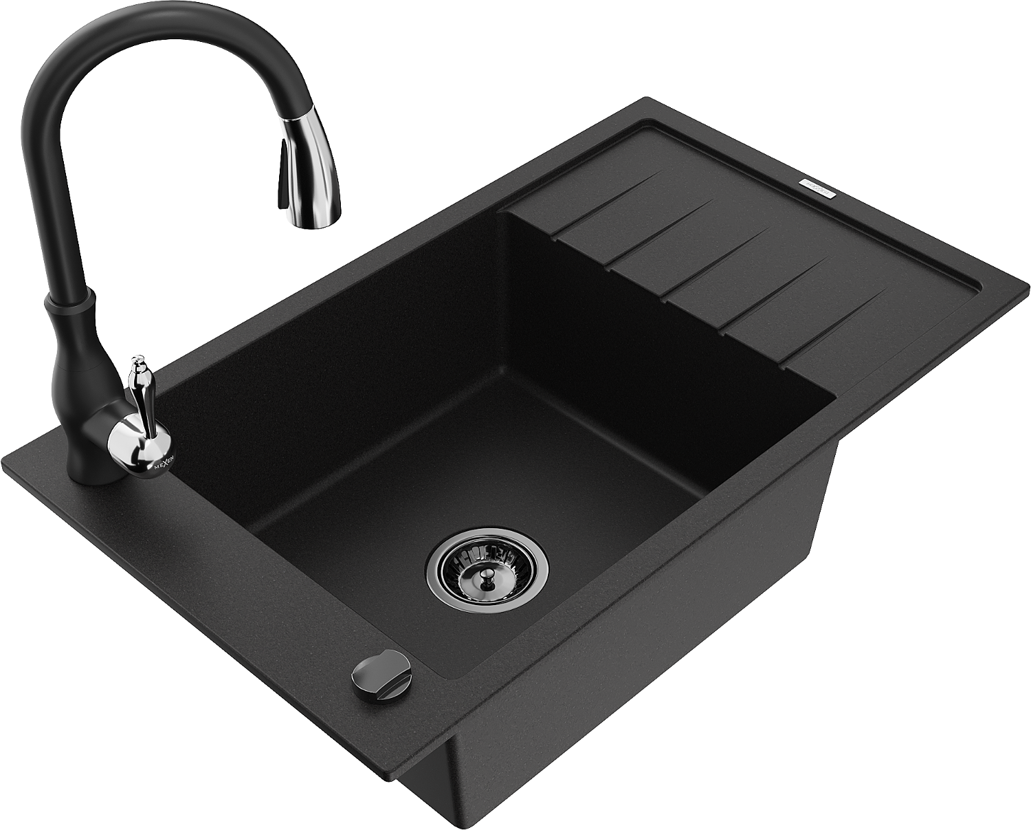 Mexen Elias granitový dřez 1-komorový s odkapávačem a kuchyňskou baterií Savita, černý - 6511-77-672601-70-B