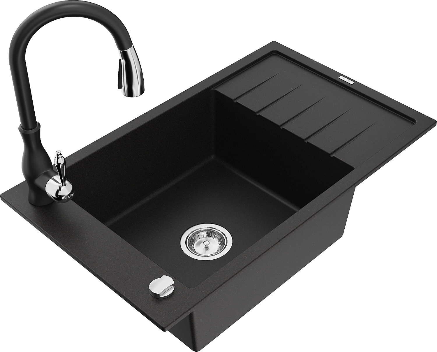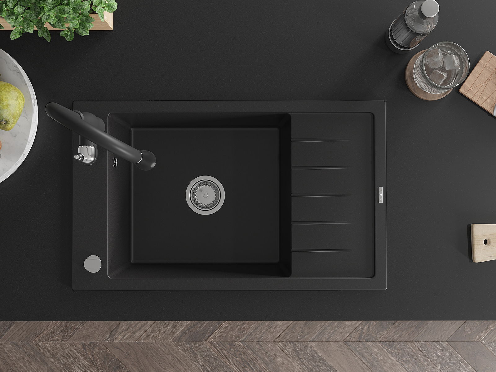 Mexen Elias granitový dřez 1-komorový s odkapávačem a kuchyňskou baterií Savita, černý - 6511-77-672601-70