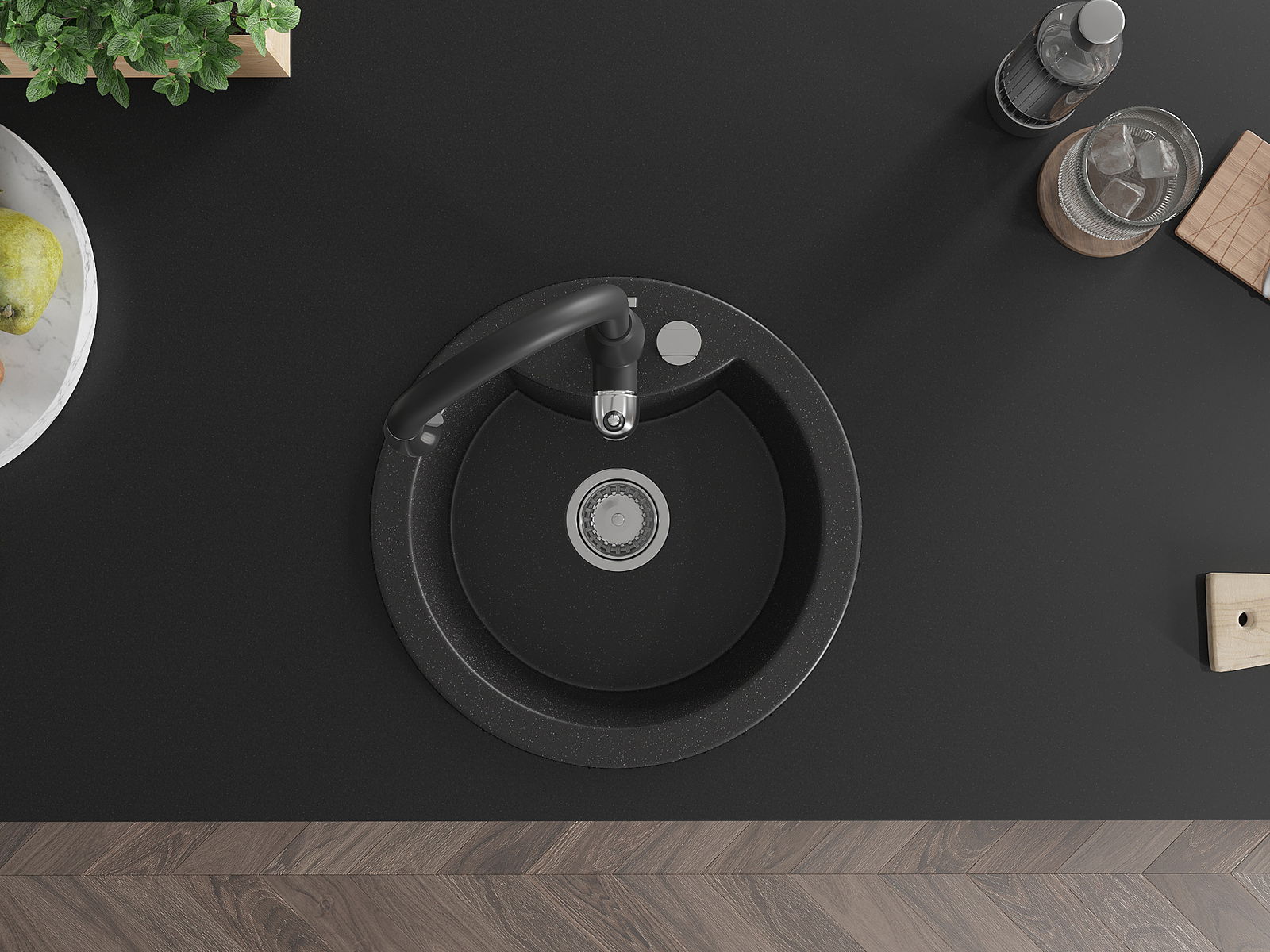 Mexen Diego kuchyňský dřez granitový 1-komorový s kuchyňskou baterií Savita, černý/stříbrný metalik - 6512-73-672601-70