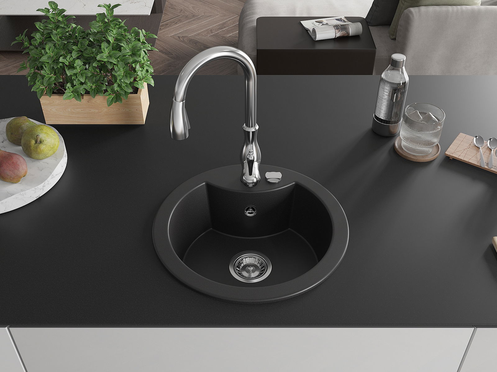 Dřez má předfrézovaný otvor o průměru 35 mm k samostatnému proražení. Může být použit například k montáži dávkovače na tekutinu, který eliminuje přítomnost plastových lahví v kuchyni a dodá jí elegantní finiš.