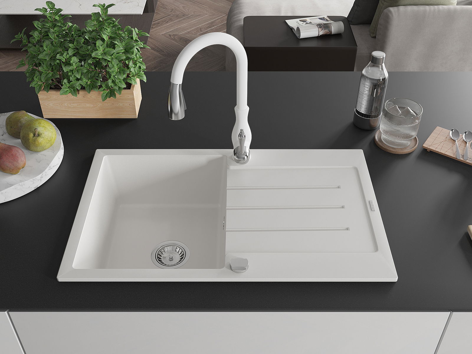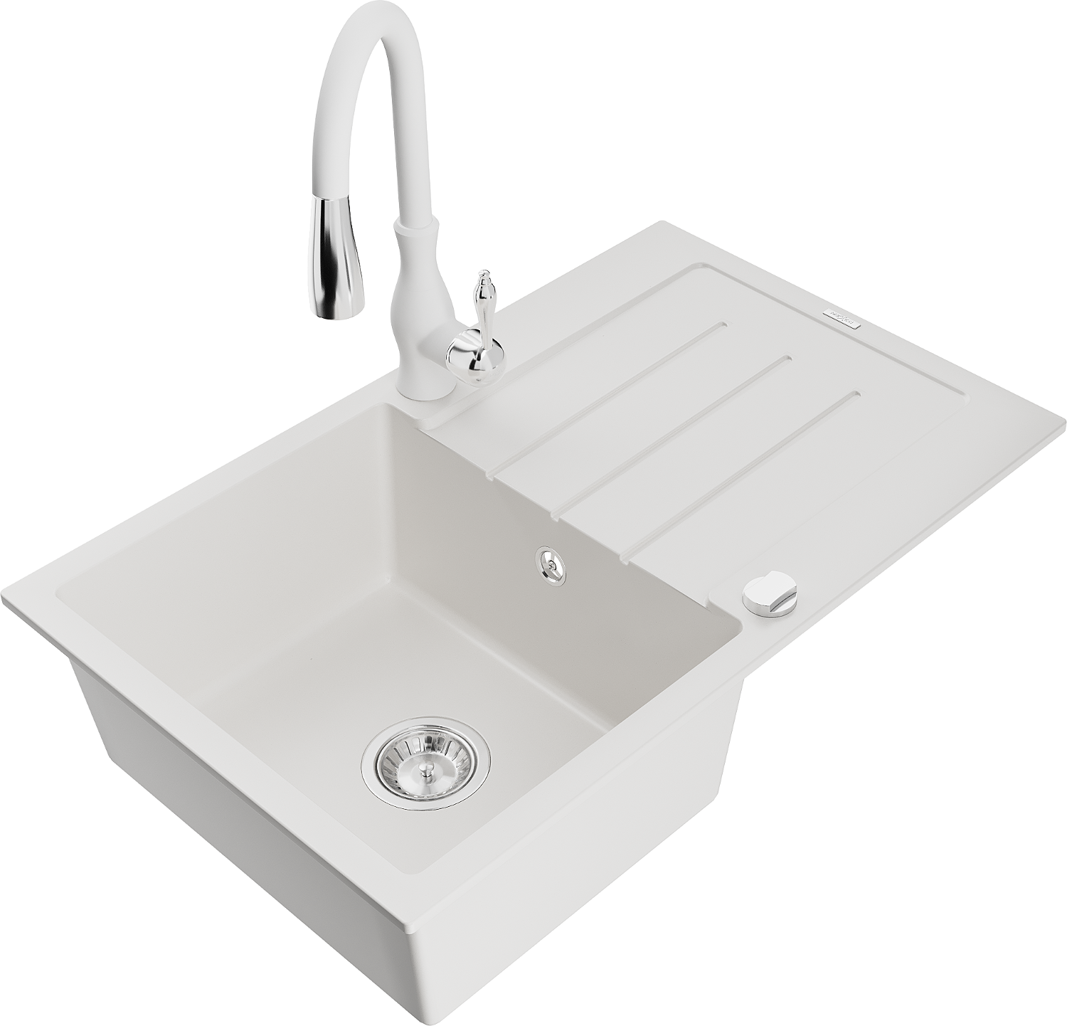 Mexen Bruno jednovanový granitový dřez s odkapávačem a kuchyňskou baterií Savita, bílý - 6513-20-672601-20