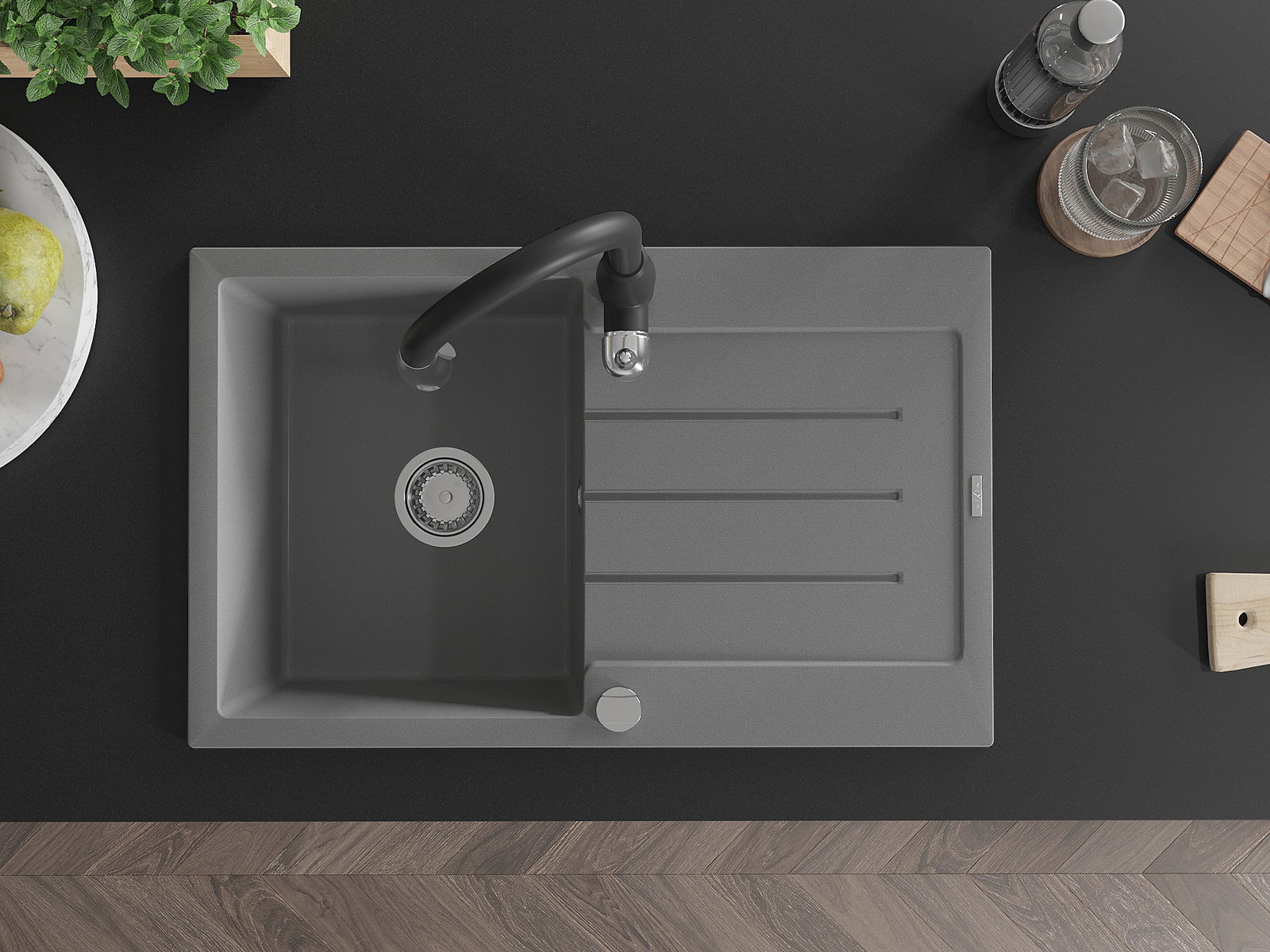 Mexen Bruno granitový dřez s 1 komorou s odkapávačem a kuchyňskou baterií Savita, šedý - 6513-71-672601-70