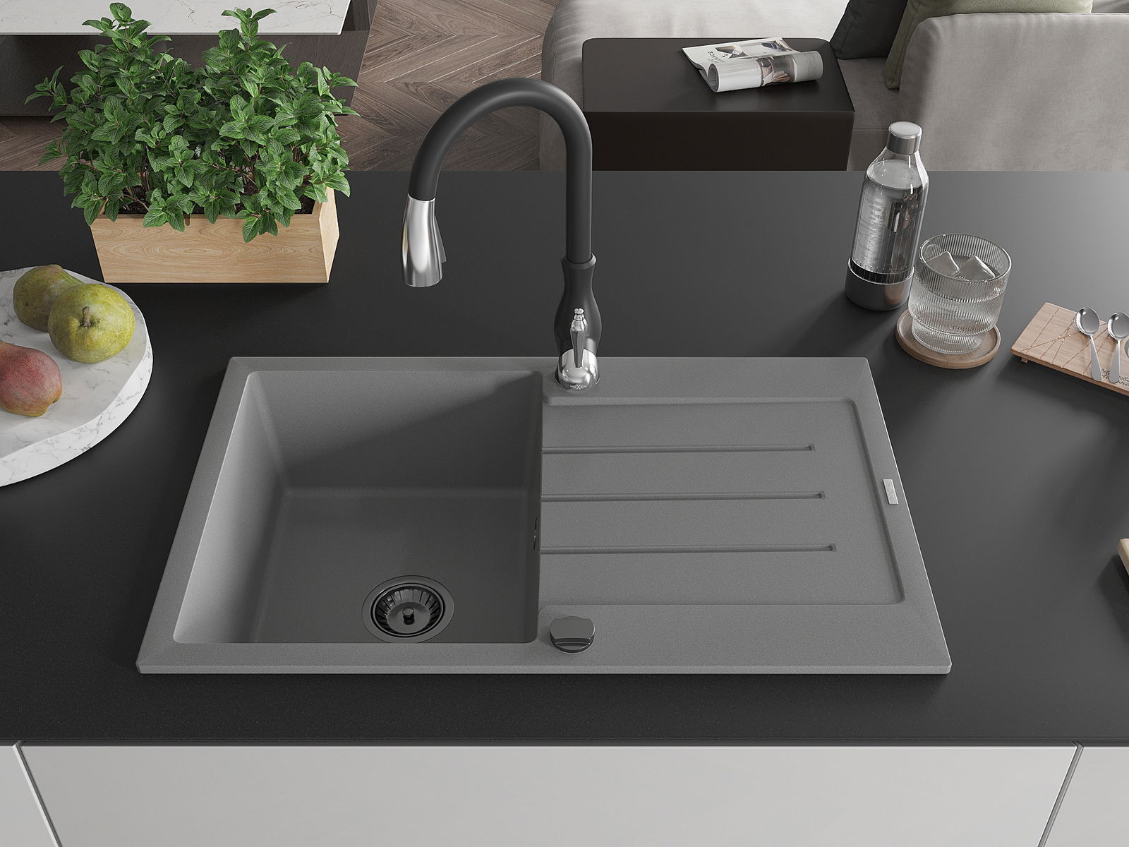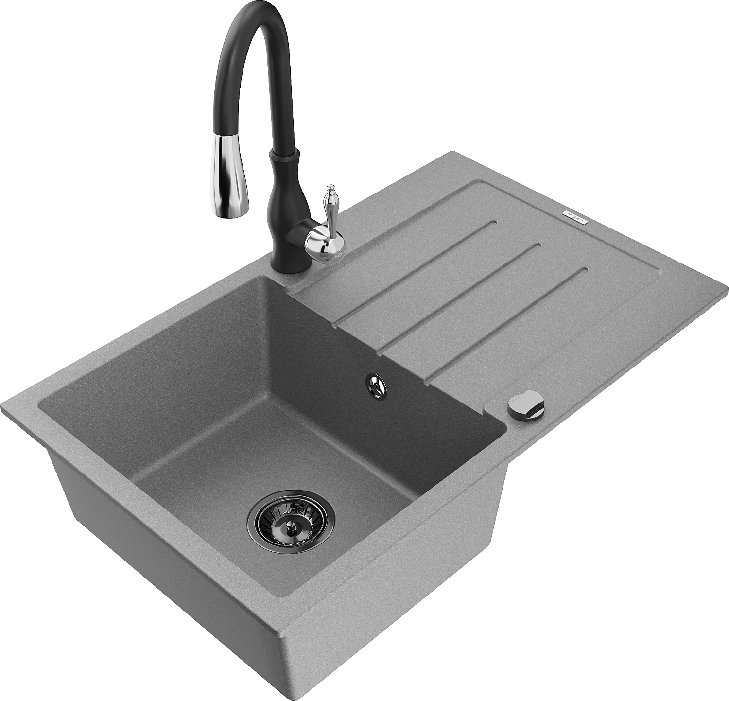 Mexen Bruno granitový dřez 1-komorový s odkapávačem a kuchyňskou baterií Savita, šedý - 6513-71-672601-70-B