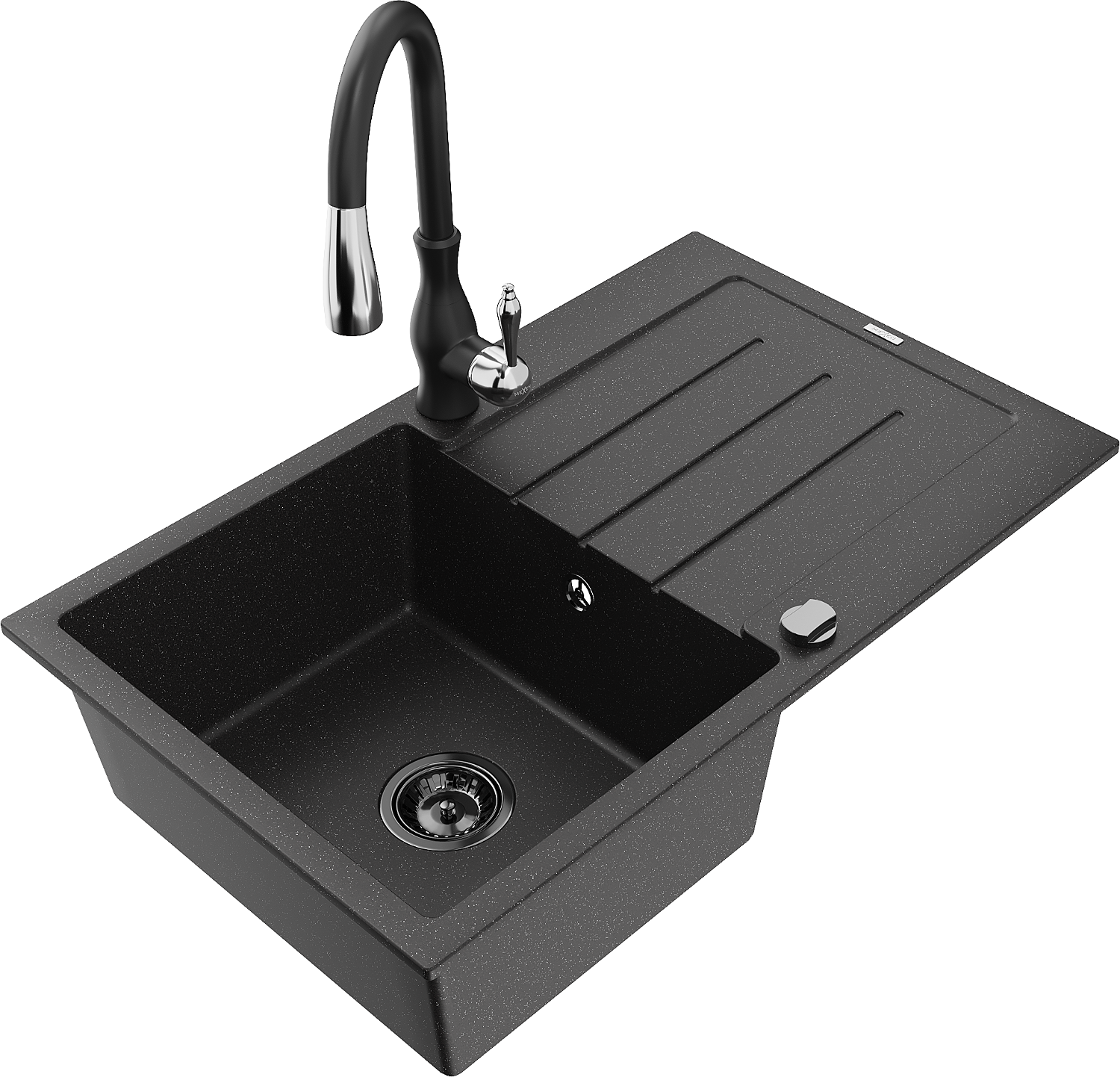 Mexen Bruno keramický dřez s jednou komorou a odkapávačem a kuchyňskou baterií Savita, černý/stříbrný - 6513-73-672601-70-B