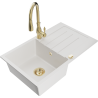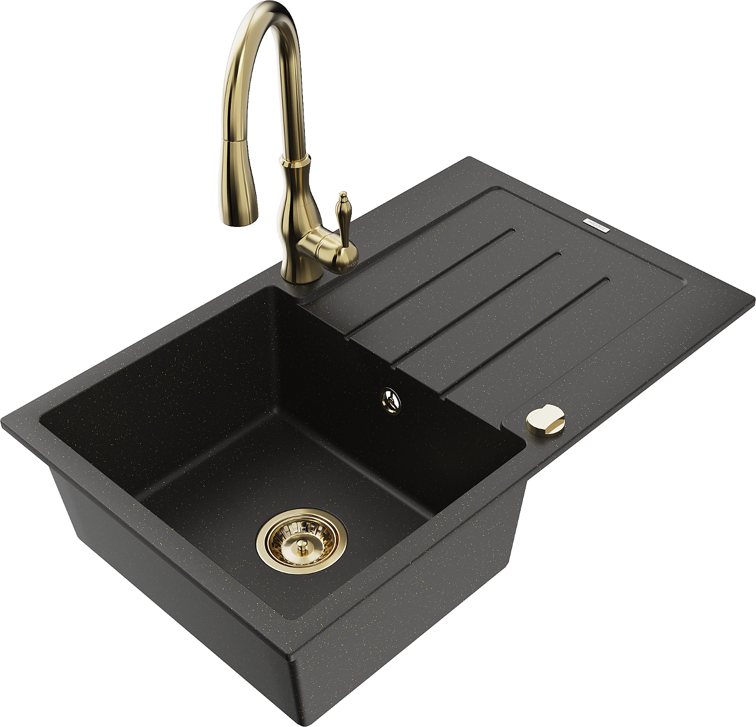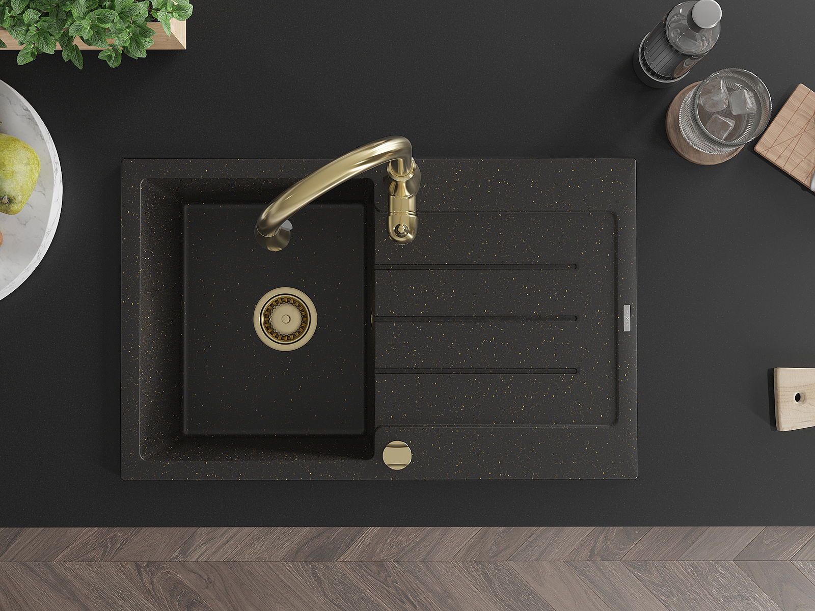 Mexen Bruno granitový dřez 1-komorový s odkapávačem a kuchyňskou baterií Savita, černý/zlatý metalik - 6513-75-672601-50