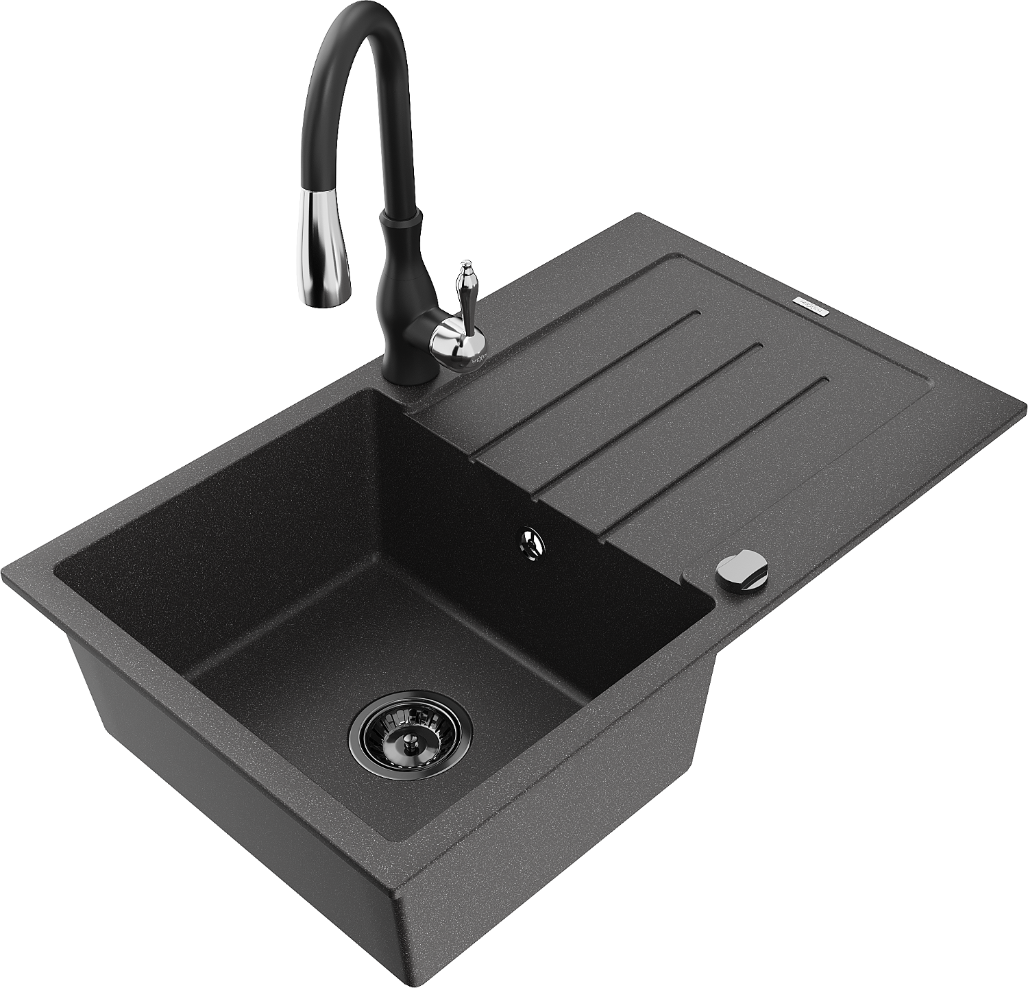 Mexen Bruno granitový dřez 1-komorový s odkapávačem a kuchyňskou baterií Savita, černý s kropením - 6513-76-672601-70-B
